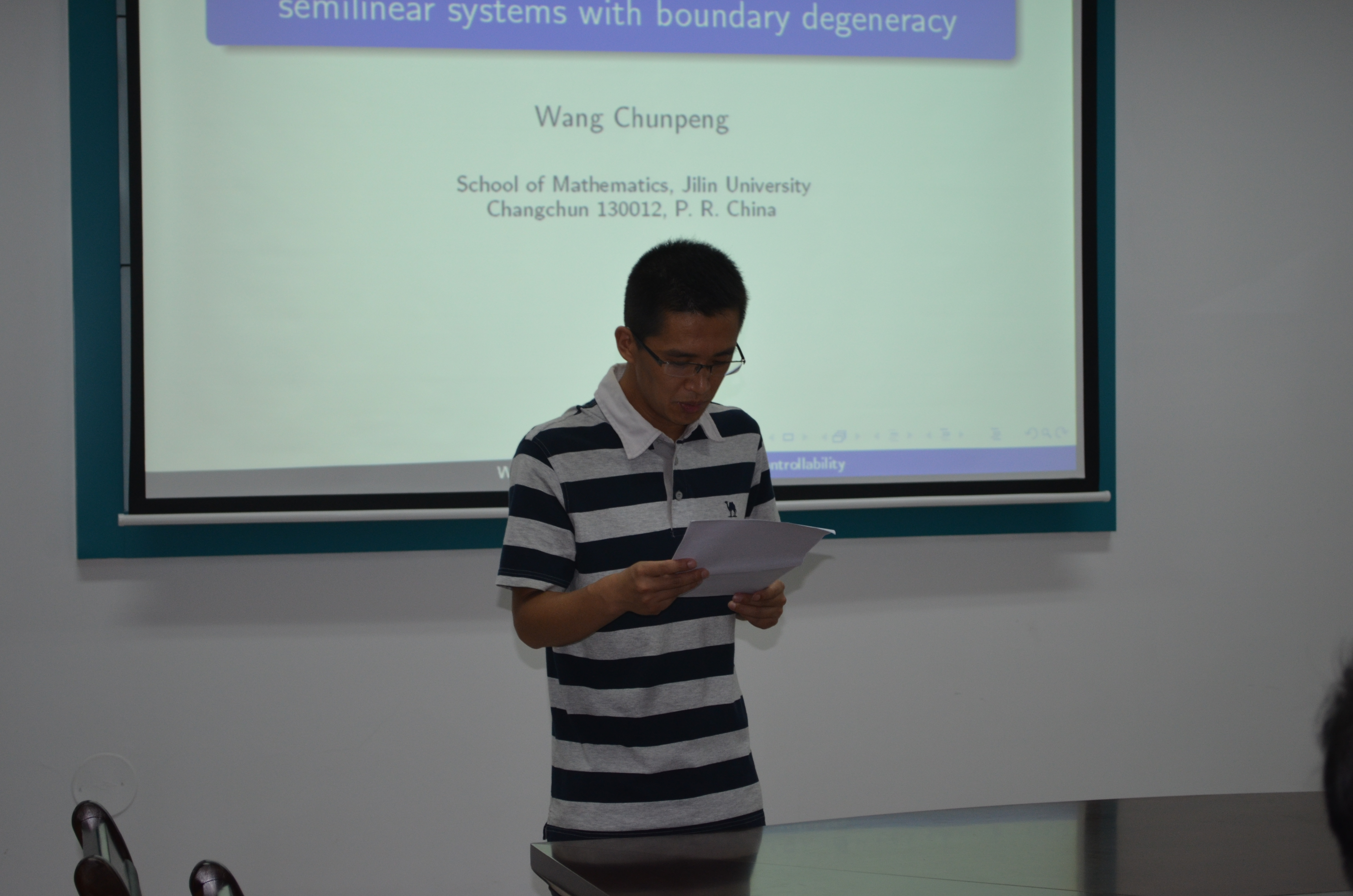 2014年7月21日上午9:30,吉林大学王春朋教授在数学系会议室(格物楼503)做了题为《Approximate controllability of a class of semilinear systems with boundary degeneracy》的学术报告,报告由孙杰宝副教授主持,数学系二十余位师生听取了学术报告并进行了热烈的讨论。