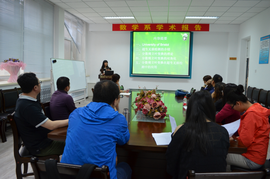 2015年6月5日15:00,应用数学研究所张海莹博士在数学系会议室(格物楼503)做了题为《分数傅立叶变换在超生无损检测中的应用》的学术报告,报告由李莉副教授主持,数学系十余位师生听取了报告并进行了热烈的讨论。