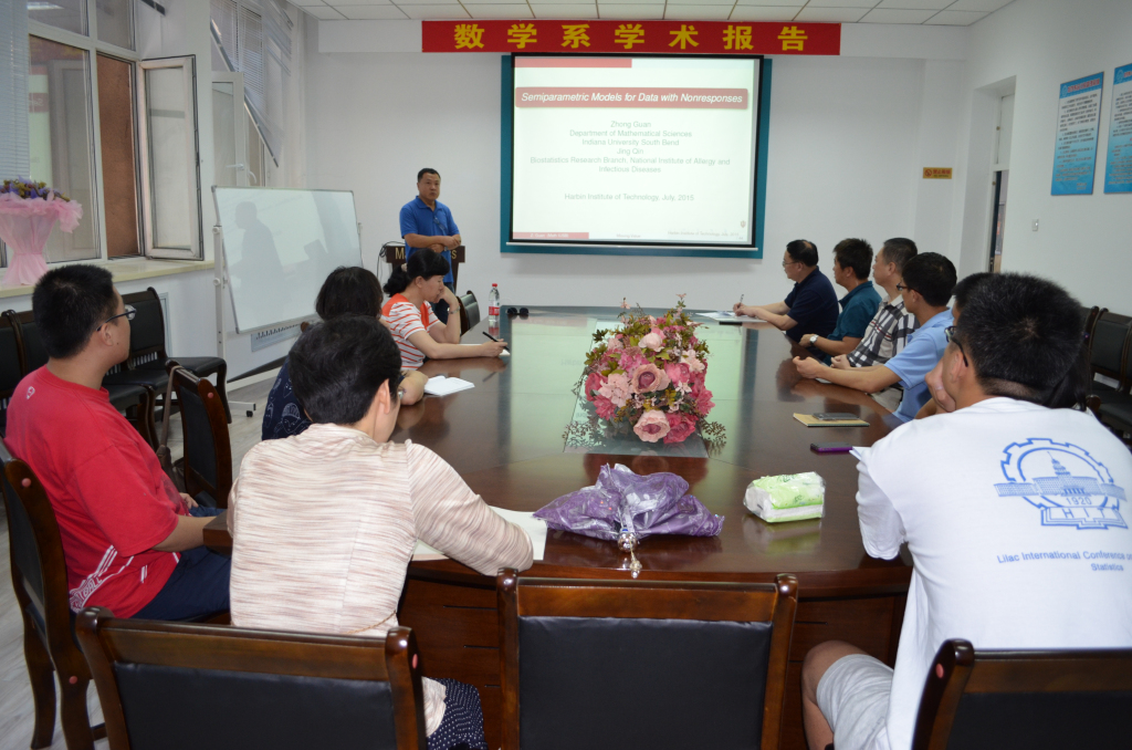 2015年7月15日下午和7月19日上午,美国印第安纳大学南本德分校关忠教授在数学系会议室(格物楼503)做了4场精彩的学术报告,报告由田波平教授主持,数学系10余位师生听取了报告,并进行了热烈的讨论。