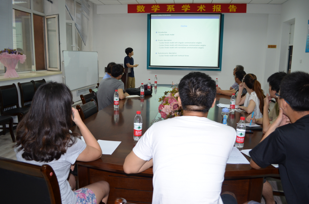 2015年8月7日上午9:00,伦敦帝国公司Choi Young-Pil博士在数学系会议室(格物楼503)做了题为《Mathematical modelling of flocking dynamics》的学术报告,报告由李祝春老师主持,数学系十余位师生听取了报告,并进行了热烈的讨论。