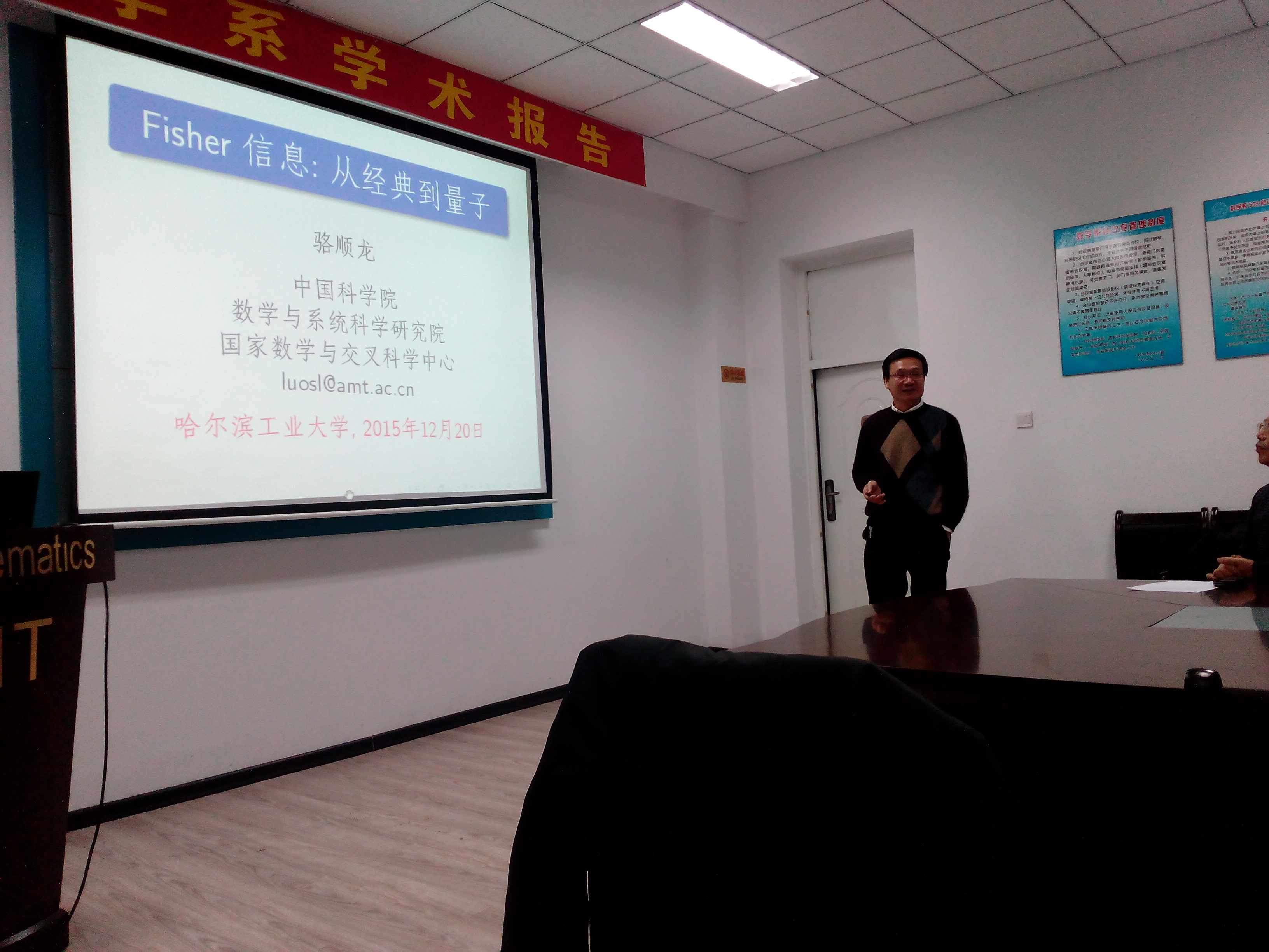 2015年12月20日 下午14:30 ,中国科公司数学与系统科学研究所骆顺龙研究员在数学系会议室(格物楼503)做了题为《Fisher信息:从经典到量子》的学术报告,报告由李龙锁教授主持,数学系大约20位师生听取了报告并进行了热烈的讨论。