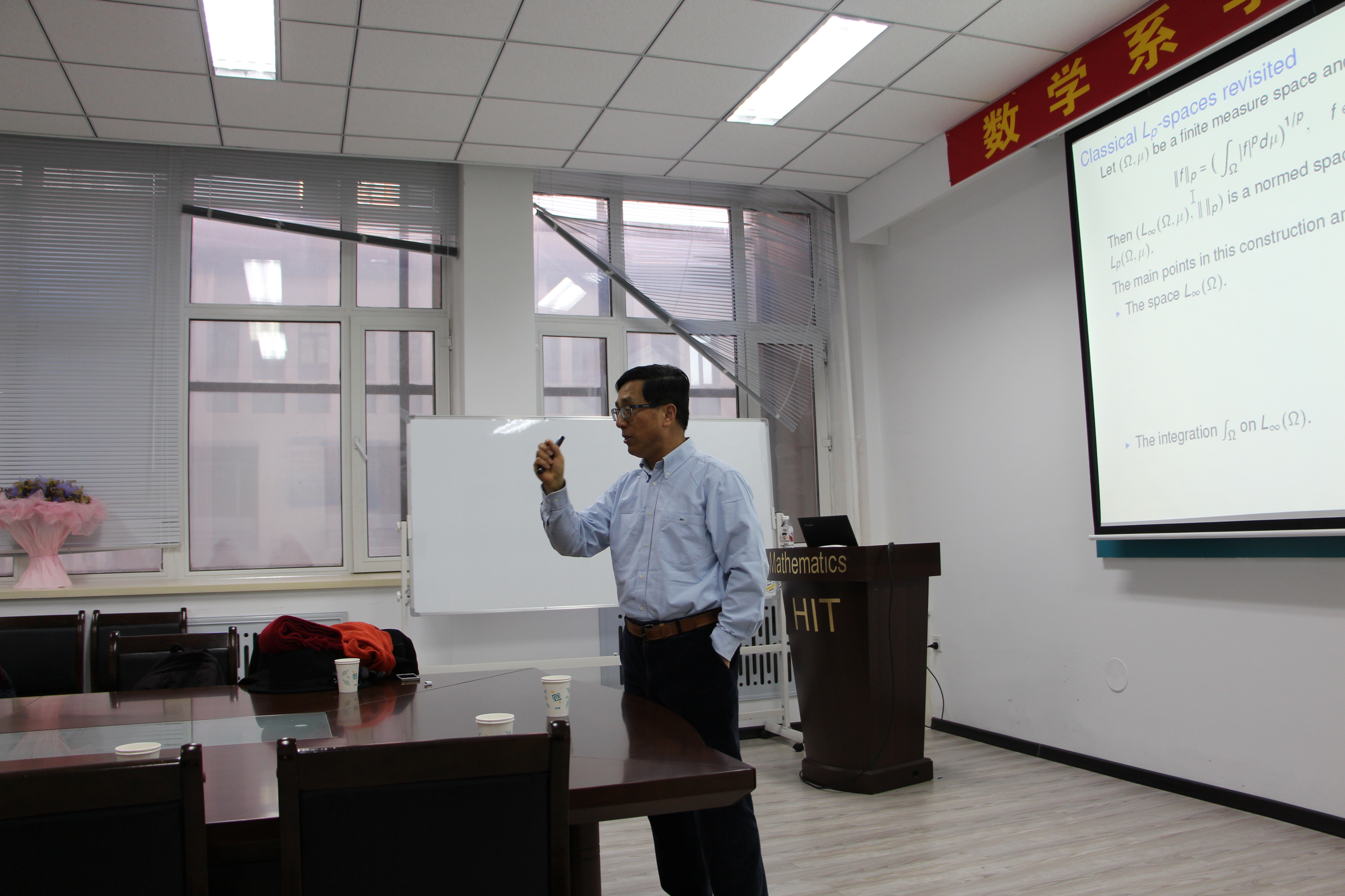 2015年12月19日上午9:00-12:00,法国弗朗什-孔泰大学数学系特级教授许全华在数学系会议室(格物楼503)做了两场精彩的报告,题目分别为《Function spaces on quantum tori》和《Harmonic analysis on noncommutative tori》,报告由薛小平老师主持,数学系20余位师生听取了报告,并进行了热烈的讨论。