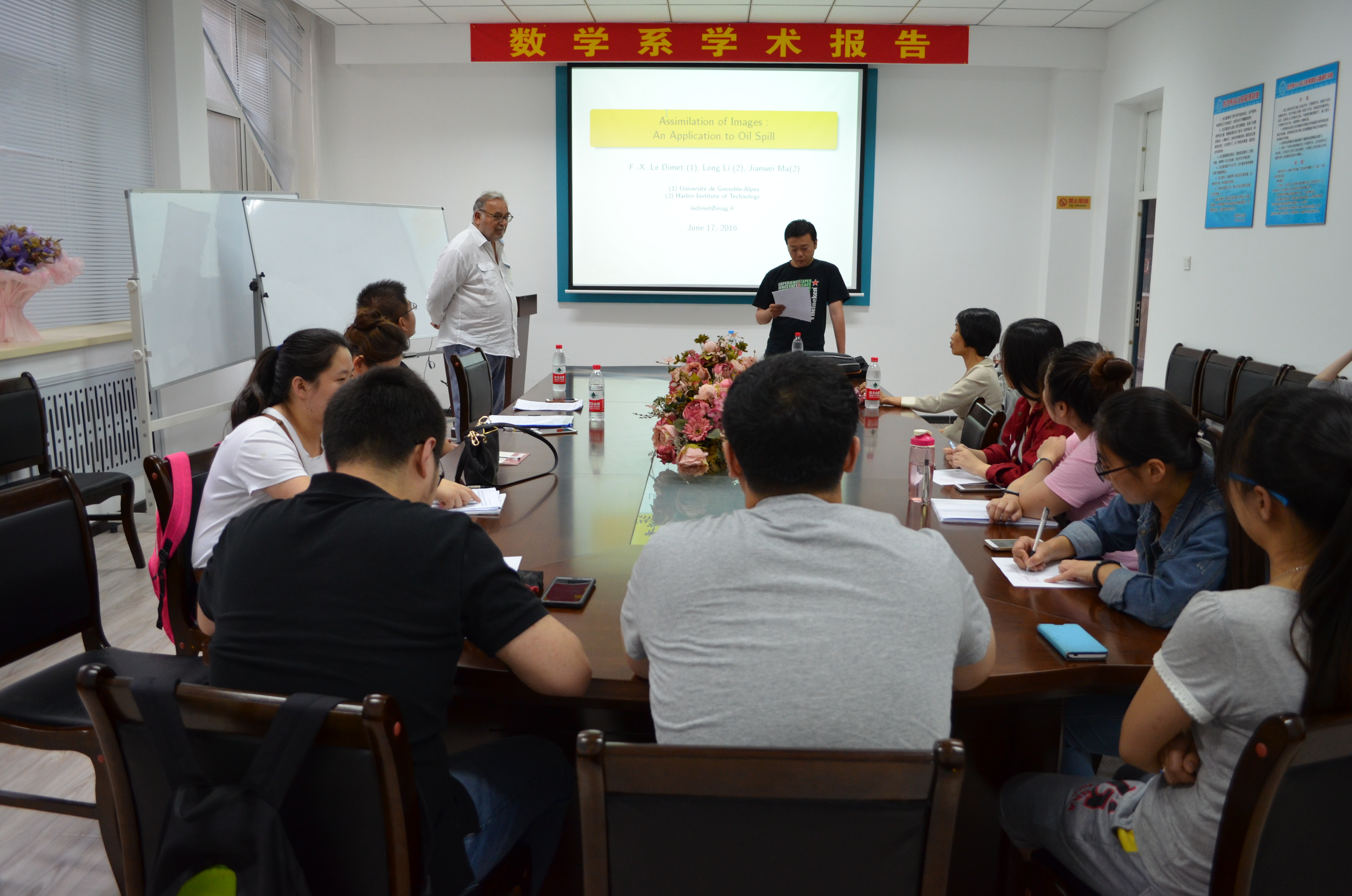 6月17号14:00-15:00,法国Grenoble第一大学数学系Francois-Xavier Le Dimet教授在数学系会议室(格物楼503)做了题为《ASSIMILATION OF IMAGES: AN APPLICATION TO OIL SPILLS》的学术报告,报告由杨畅老师主持,数学系10余位师生听取了报告,并进行了热烈的讨论。