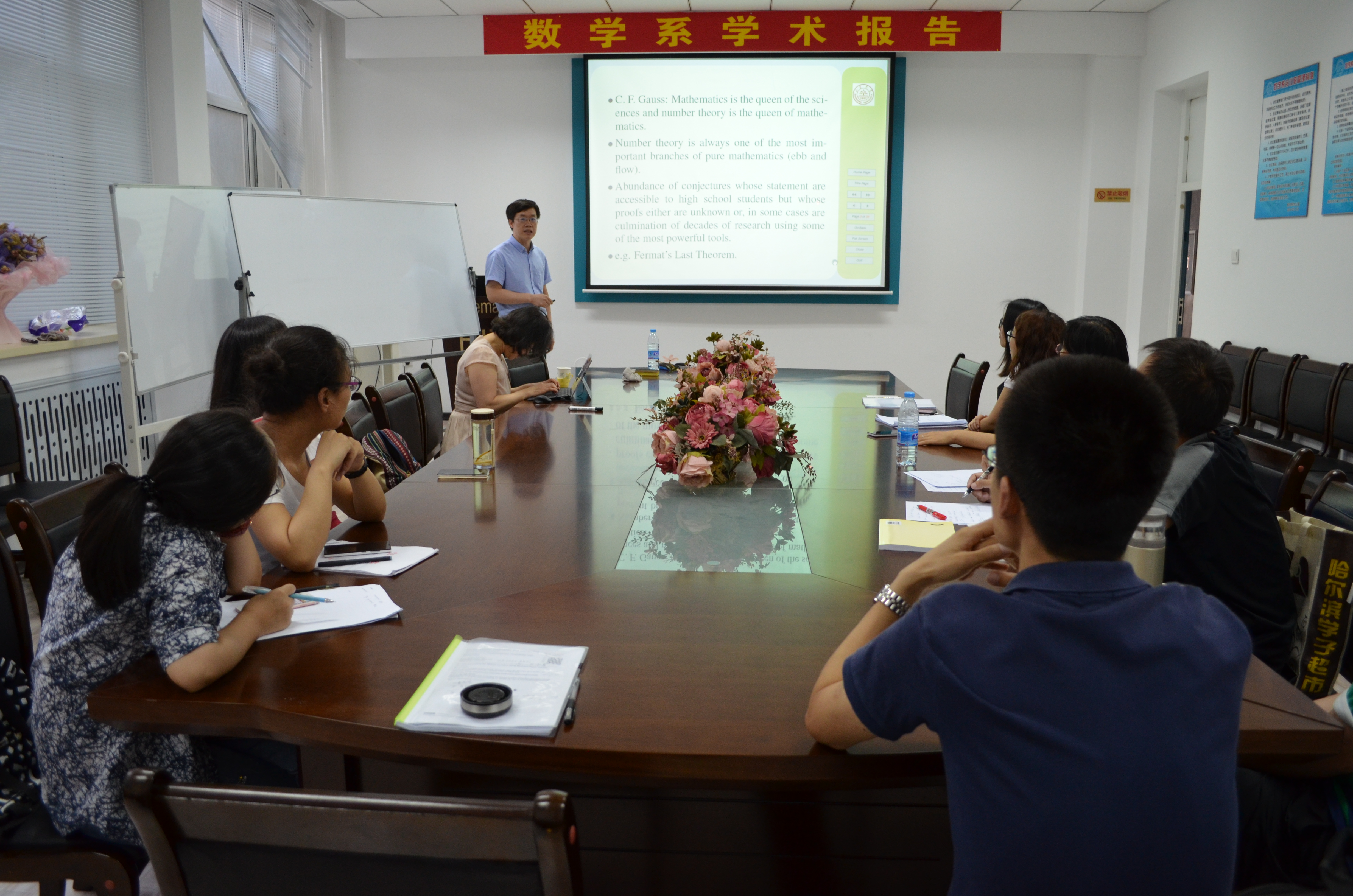 2016年6月21日和6月22日下午3:30-4:30,山东大学bwin必赢副院长,教育部新世纪优秀人才吕广世教授在数学系会议室(格物楼503)分别做了题为《Fourier coefficients of automorphic forms for higher rank groups》《Linnik's approximation to Goldbach's conjecture, and other problems》的学术报告,报告由张毅超教授主持,数学系十余位师生听取了报告,并进行了热烈的讨论。