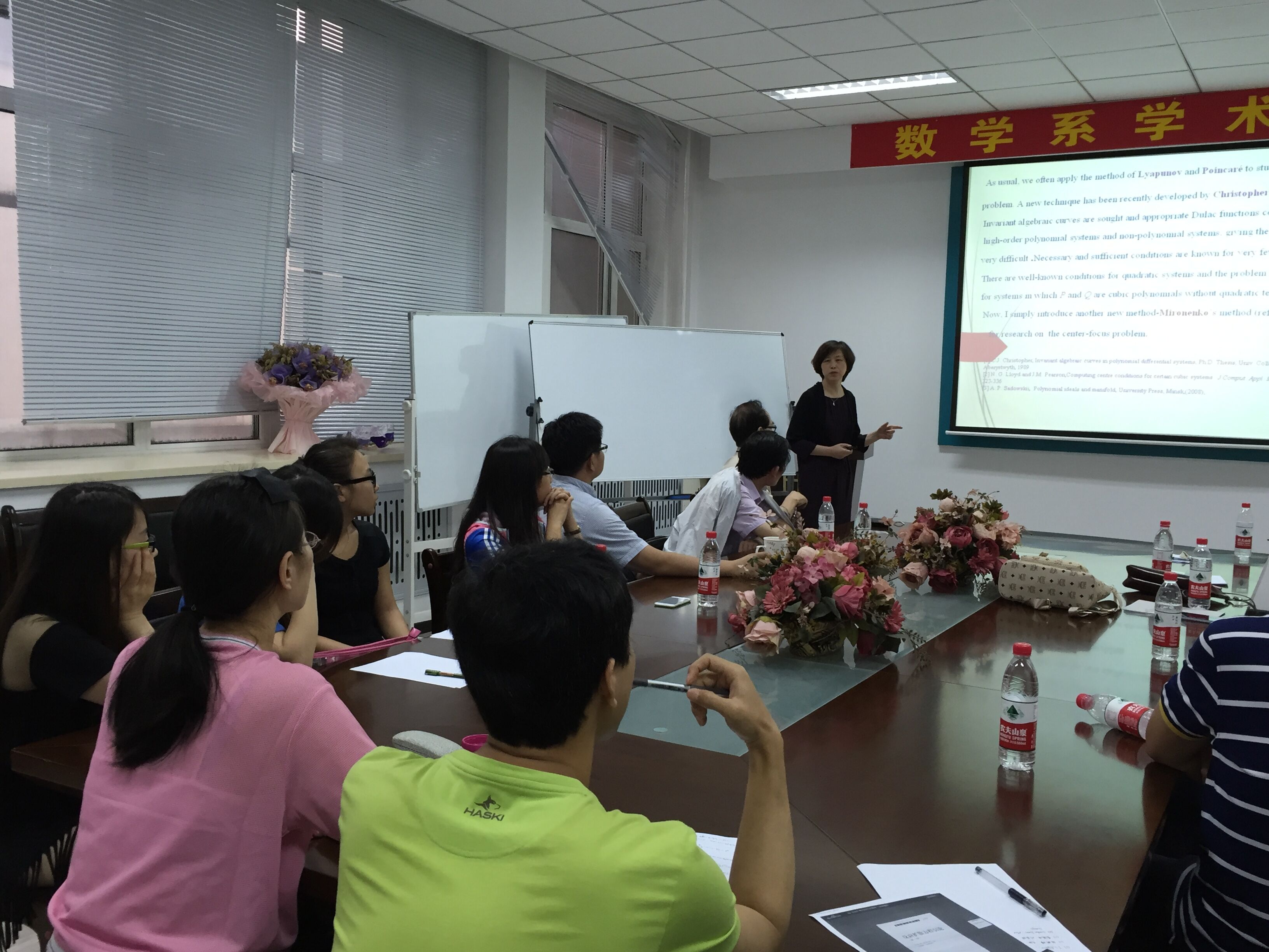2016625日上午1000--11:00,扬州大学周正新教授在数学系会议室(格物楼503)做了题为《A new method for research on the Poincaré center-focus problem》的学术报告,报告由蒋卫华老师主持,数学系20余位师生听取了报告,并进行了热烈的讨论。