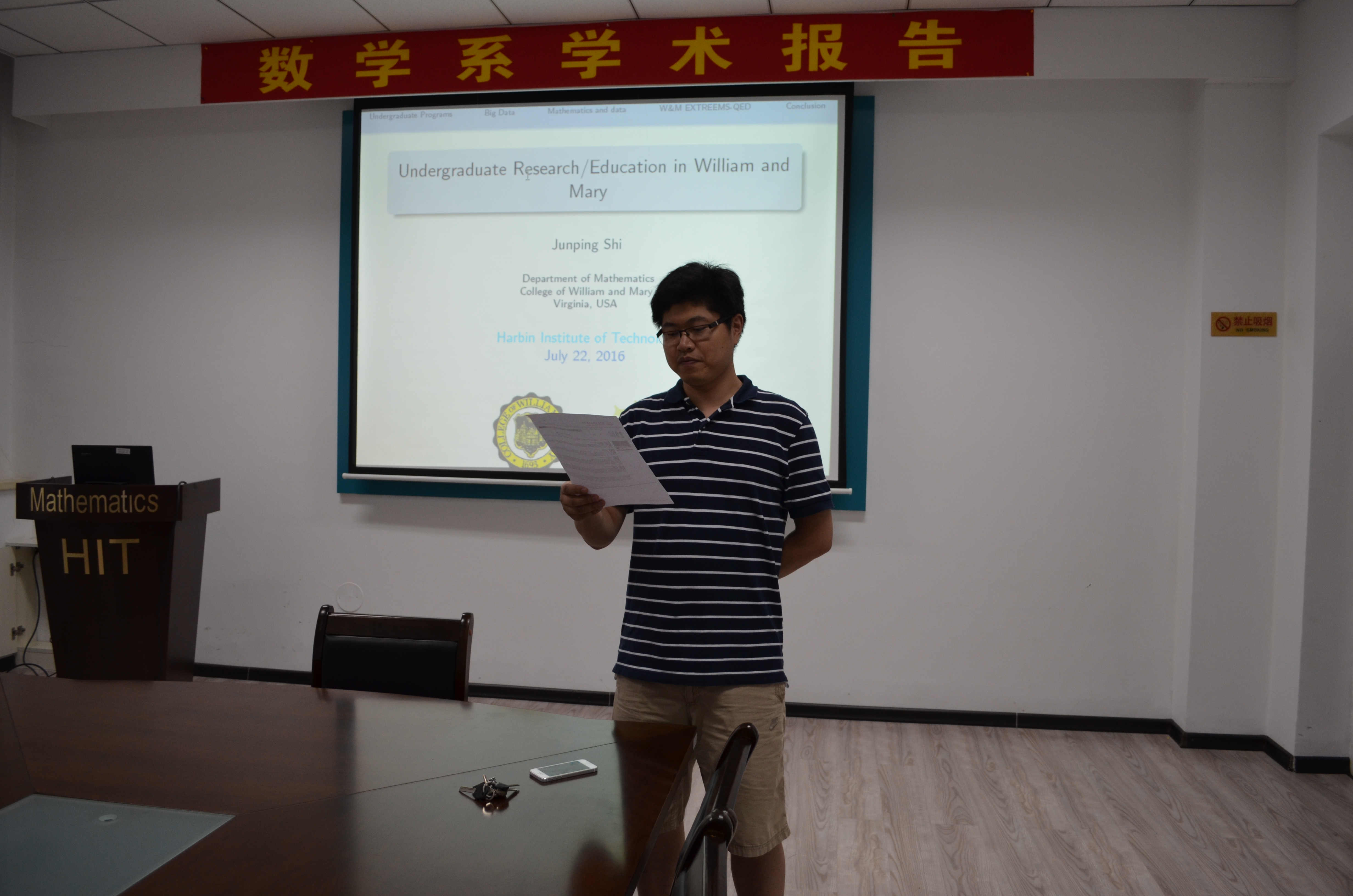 2016年7月22日下午,美国威廉玛丽公司史峻平教授在数学系会议室(格物楼503)做了2两场精彩的报告,题目分别为:《数据科学,计算数学和生物数学的本科生教育和研究》《Global Extinction of Population with Allee effect in Advective Environment》,报告由方健教授主持,数学系10余位师生听取了报告并进行了热烈的讨论。