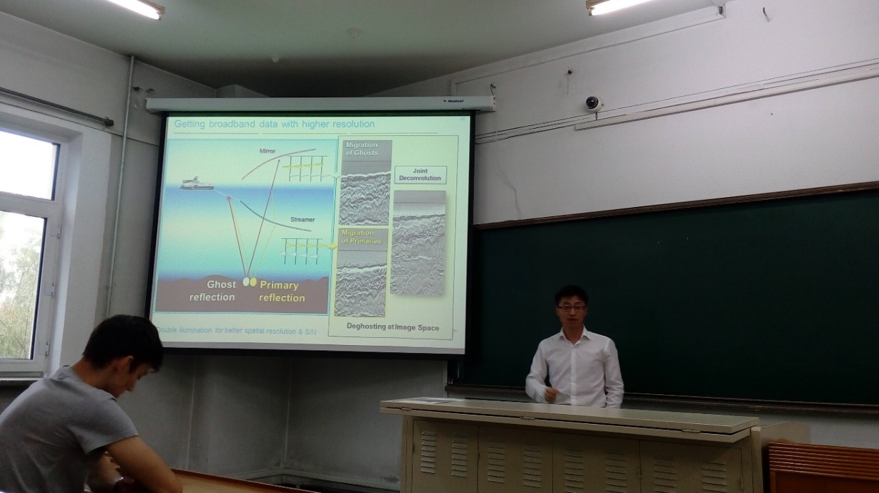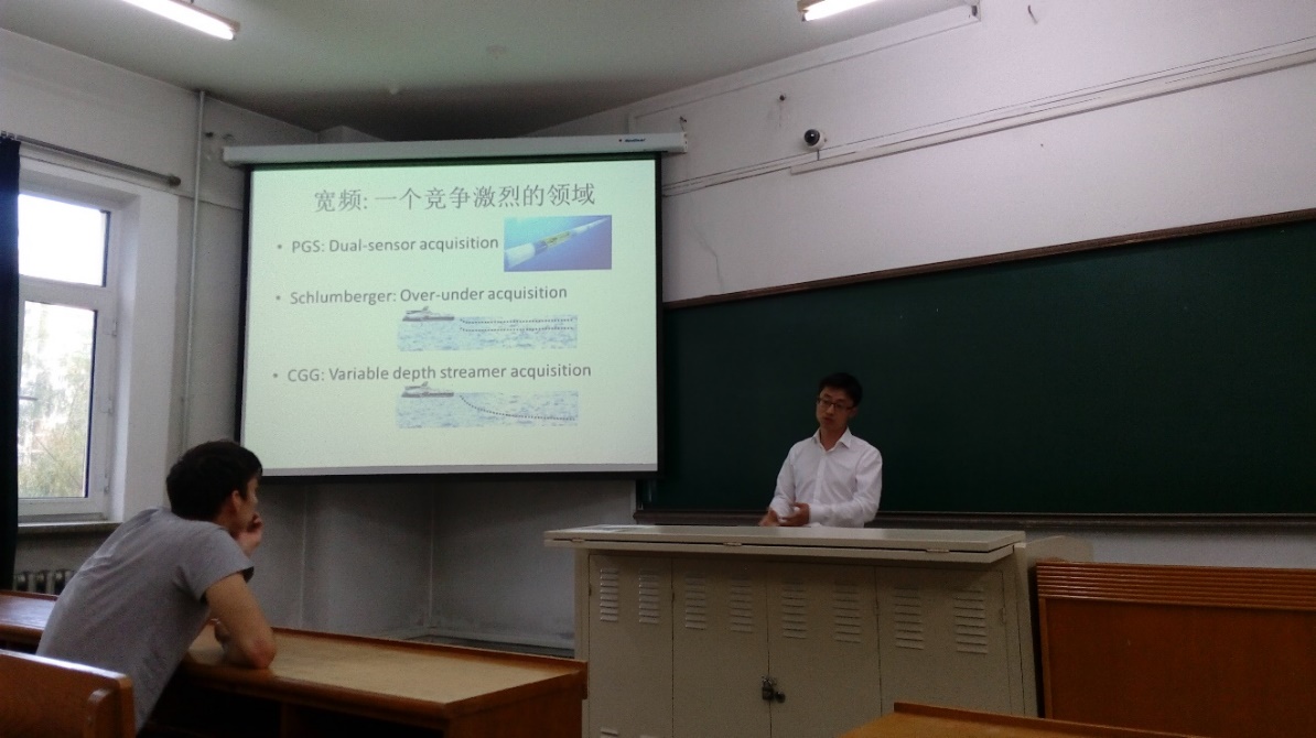 2016年9月14日下午2:00,国际著名油服公司CGG的杨峰博士在诚意楼216做了2场精彩的报告,题目分别为:《Time variant amplitude and phase dispersion correction for broadband data》《Ultra-low frequency phase assessment for broadband data》,报告由马坚伟教授主持,数学系10余位师生听取了报告并进行了热烈的讨论。