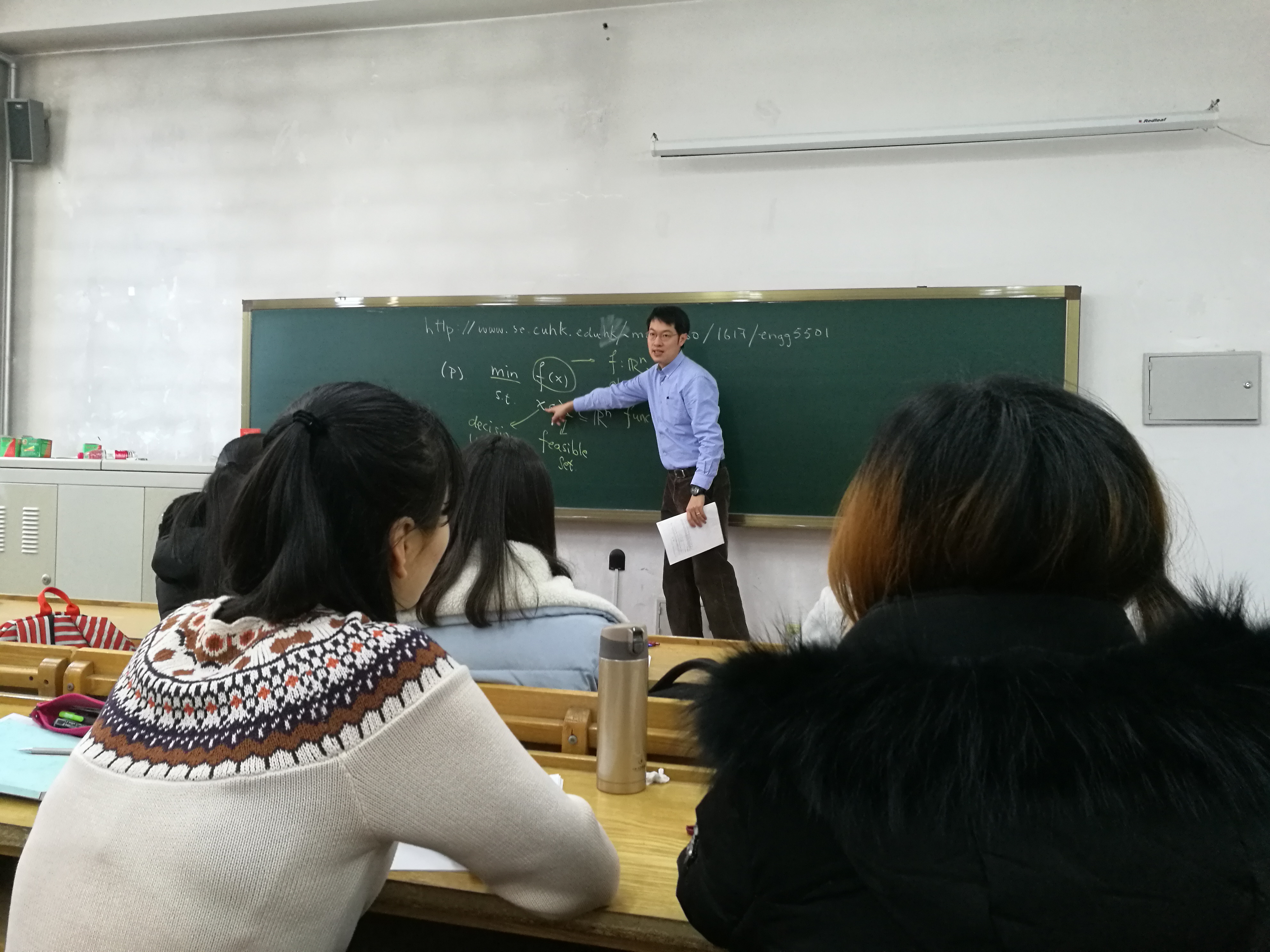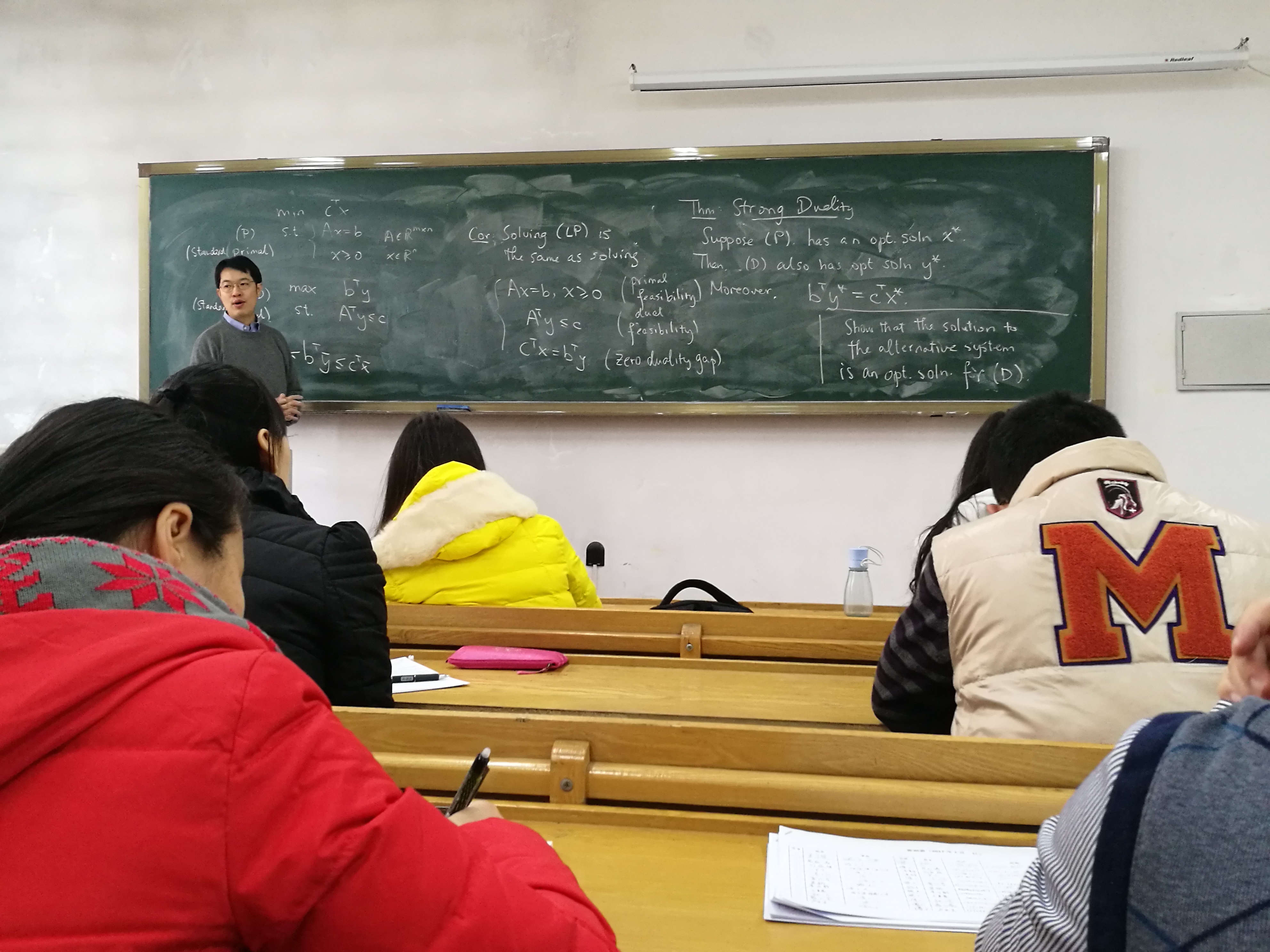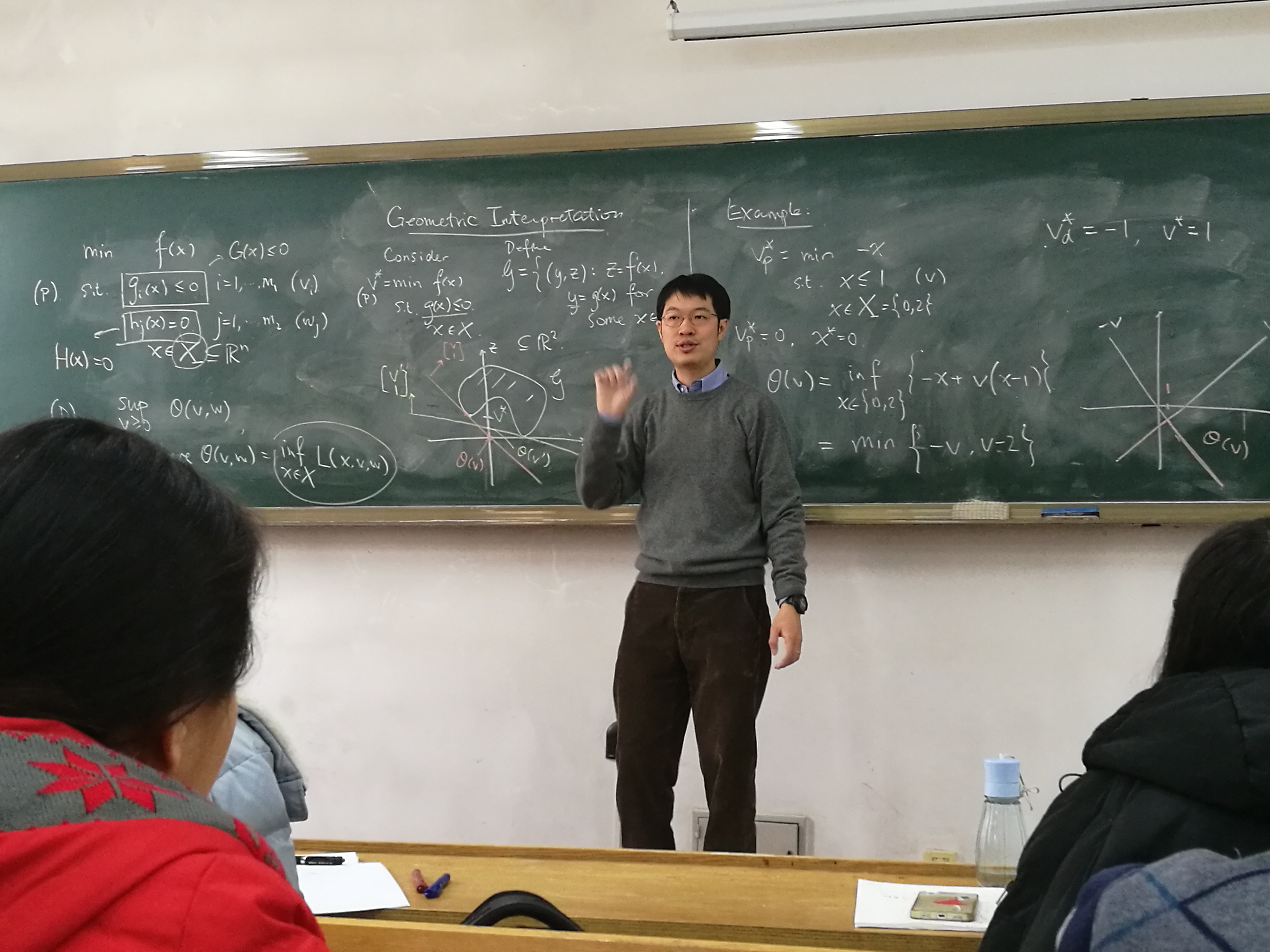 苏文藻教授此次来访bwin必赢,为数学系的员工和研究生进行了为期5天共计16个学时的授课。这次短期课程的内容主要涉及优化的基础问题。苏文藻教授从优化问题的相关基本概念出发、重点介绍了线性规划及凸规划的解的存在性、对偶问题等,最后介绍了相关的优化算法。苏文藻教授授课深入浅出,善于用浅显易懂的图表来表达深奥艰涩的数学概念,使学生受益良多。