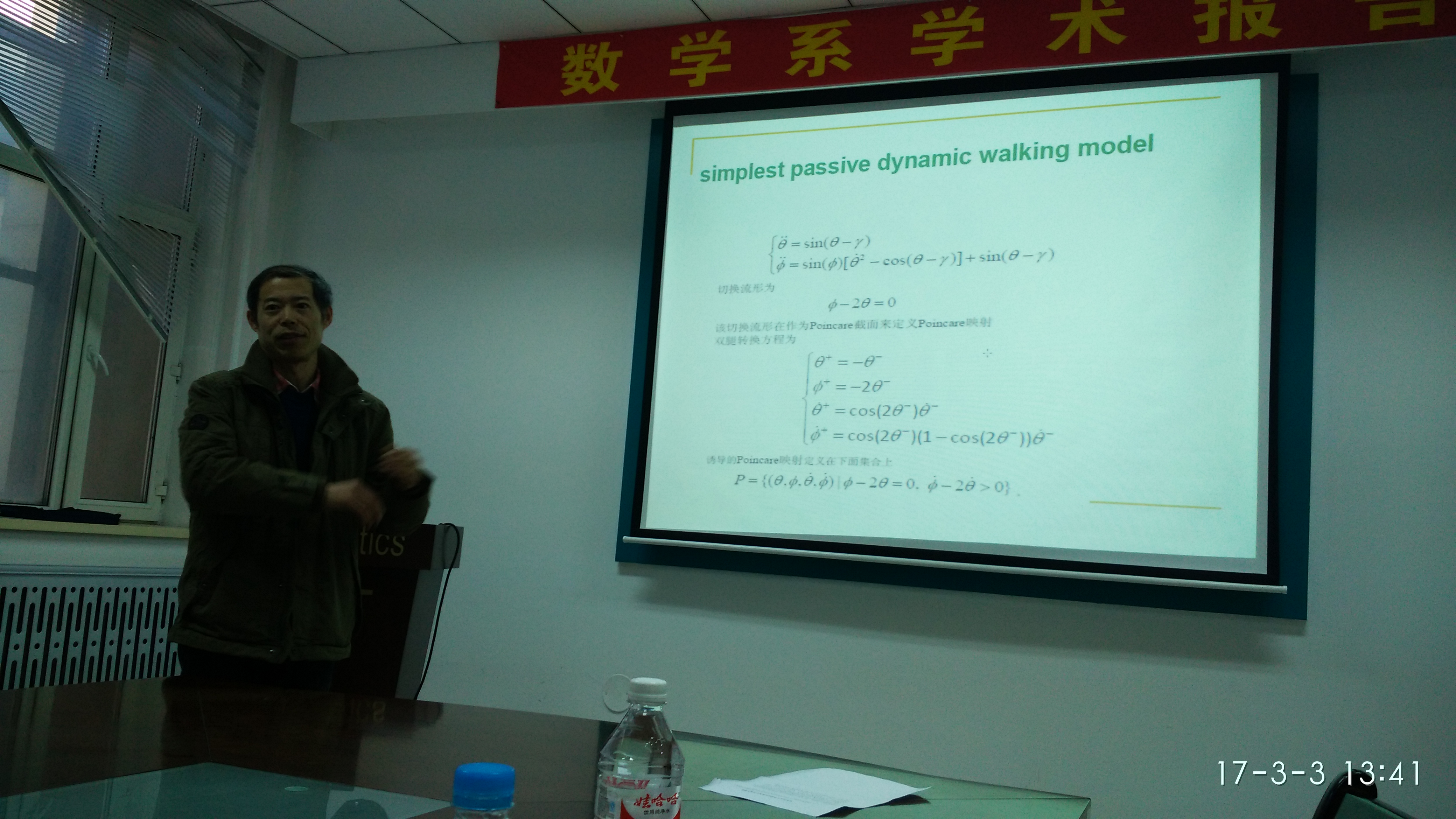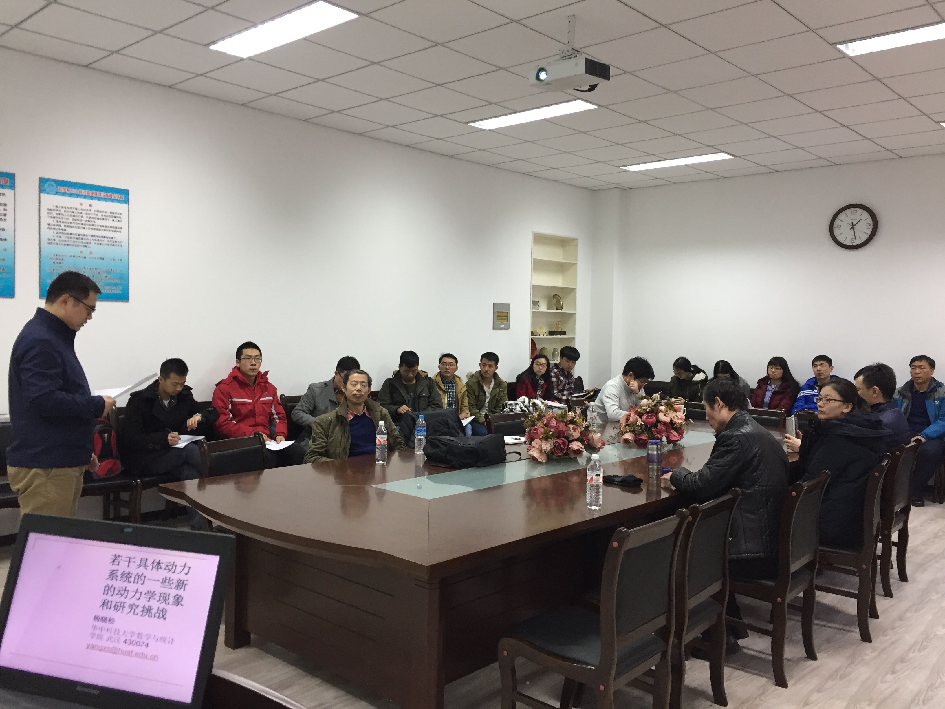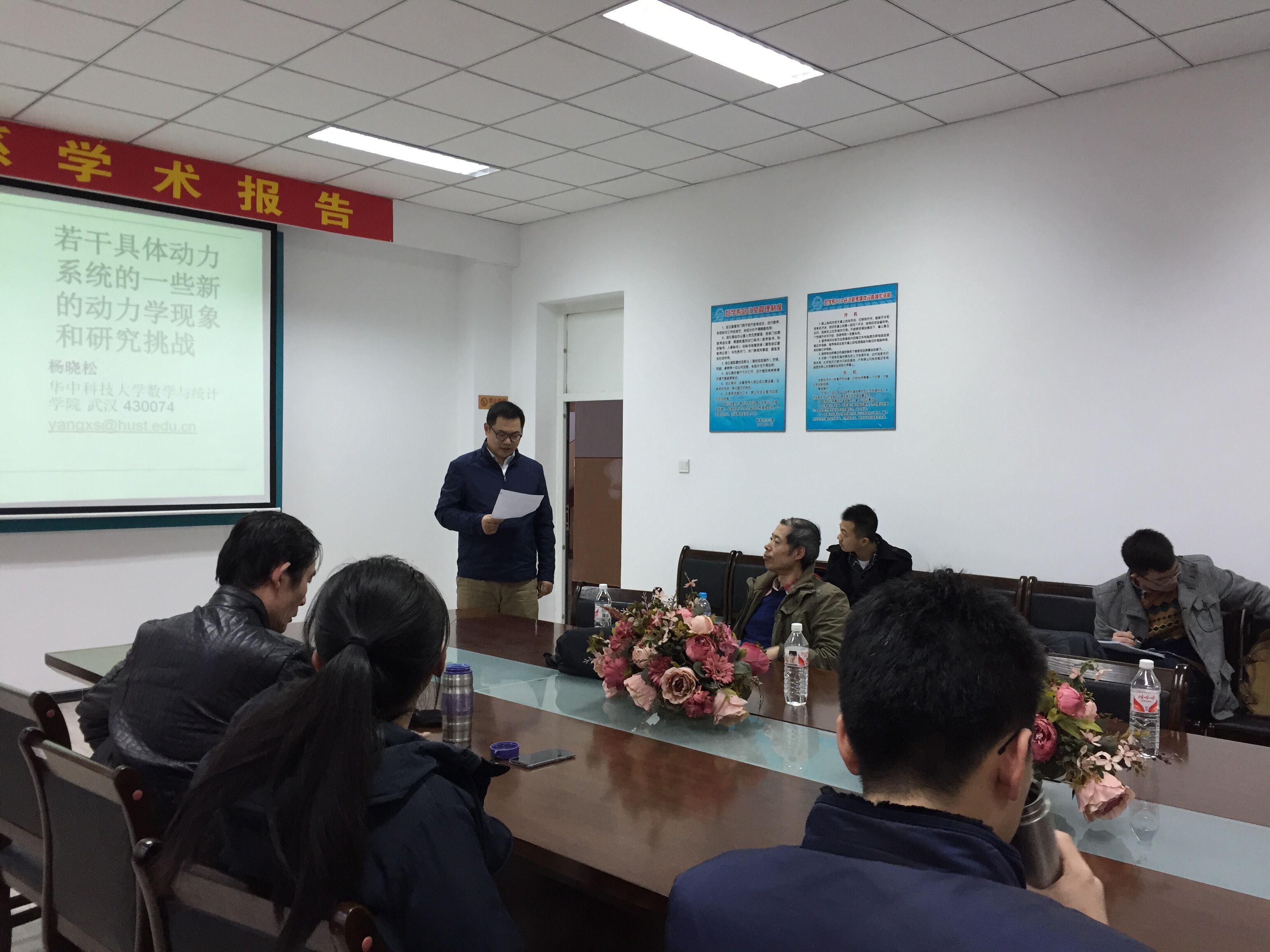 2017年3月3日 下午13:30,华中科技大学数学与统计公司杨晓松教授在格物楼503会议室做了两个精彩的报告,题目分别为: “若干具体动力系统的一些新的动力学现象和研究挑战”和“生态学的一些前沿课题及应用动力系统研究机遇”,报告由刘胜强教授主持,数学系20余位师生听取了报告,并进行了热烈的讨论。