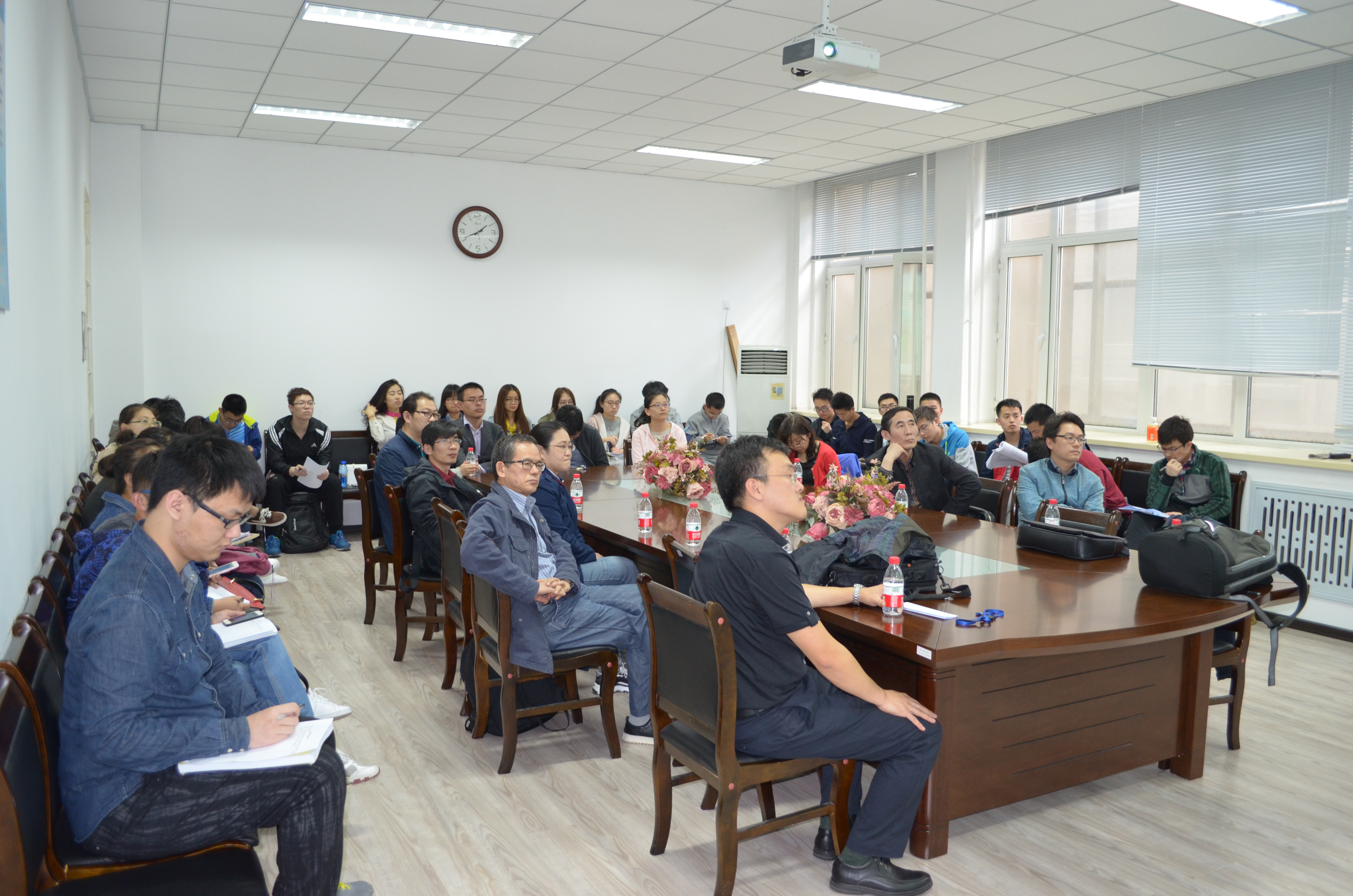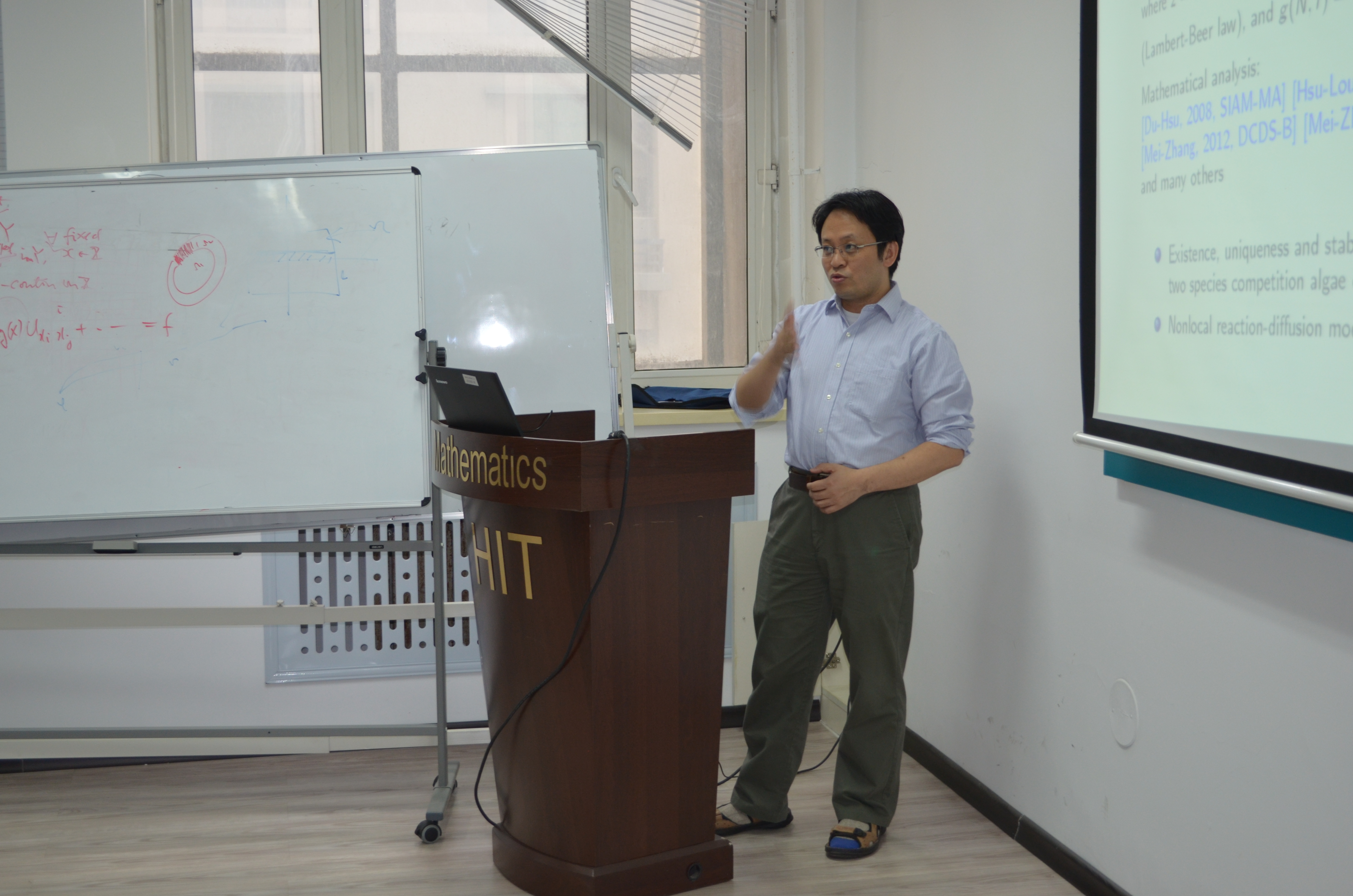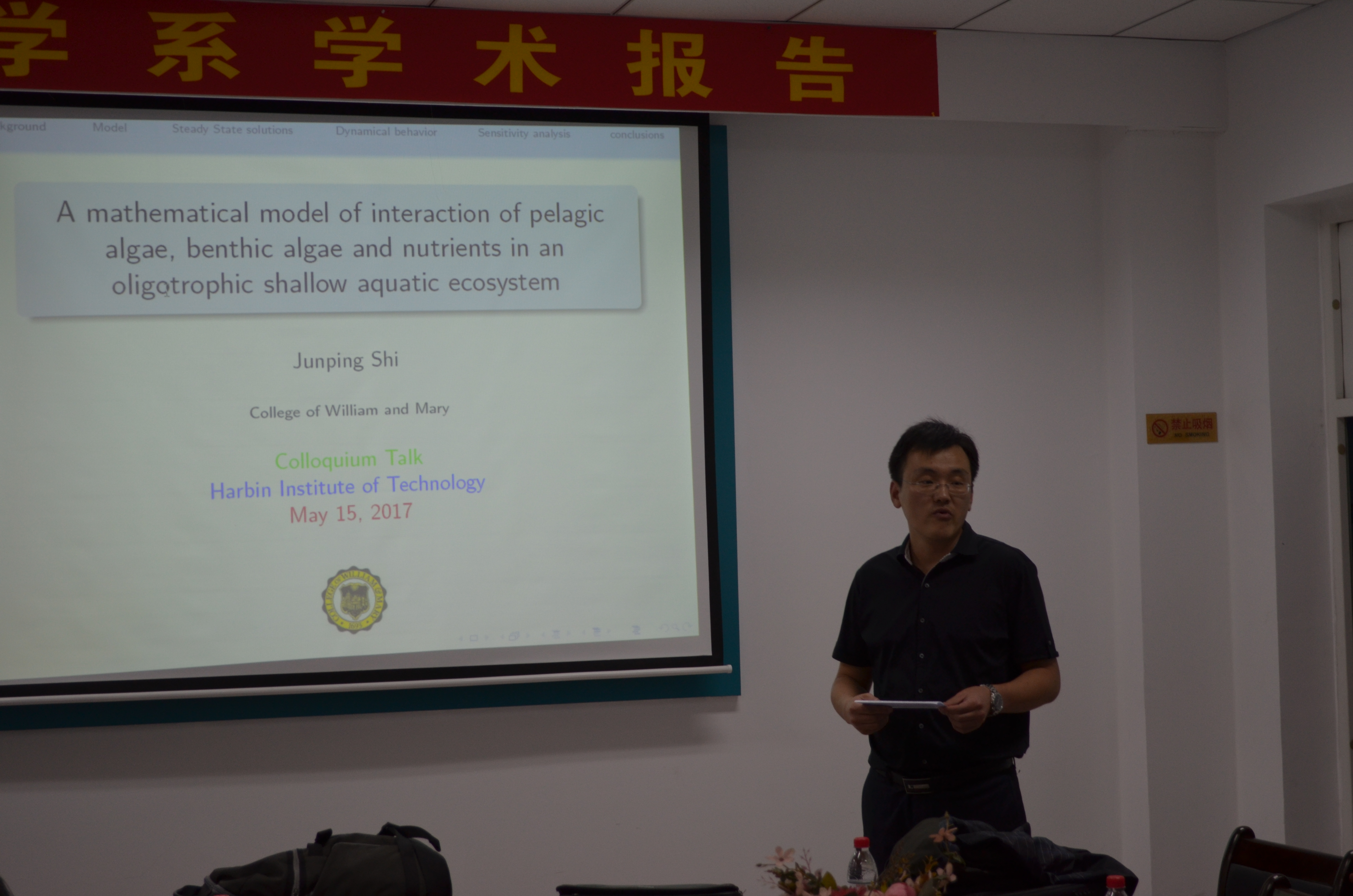 2017年5月15日 下午13:30,美国威廉玛丽公司史峻平教授在格物楼503会议室做了精彩的报告,题目为:A mathematical model of interaction of pelagic algae, benthic algae and nutrients in an oligotrophic shallow aquatic ecosystem,报告由王春程副教授主持,数学系30余位师生听取了报告,并进行了热烈的讨论。