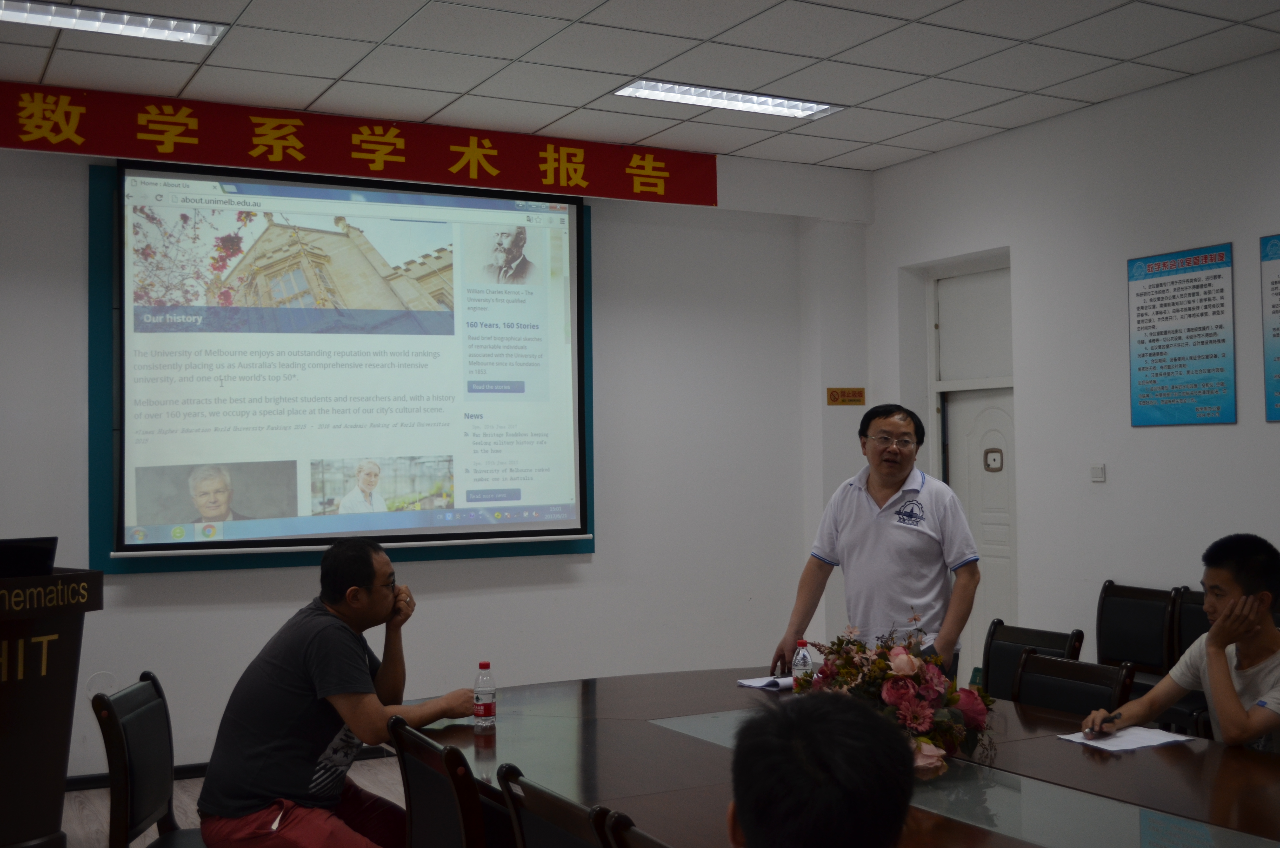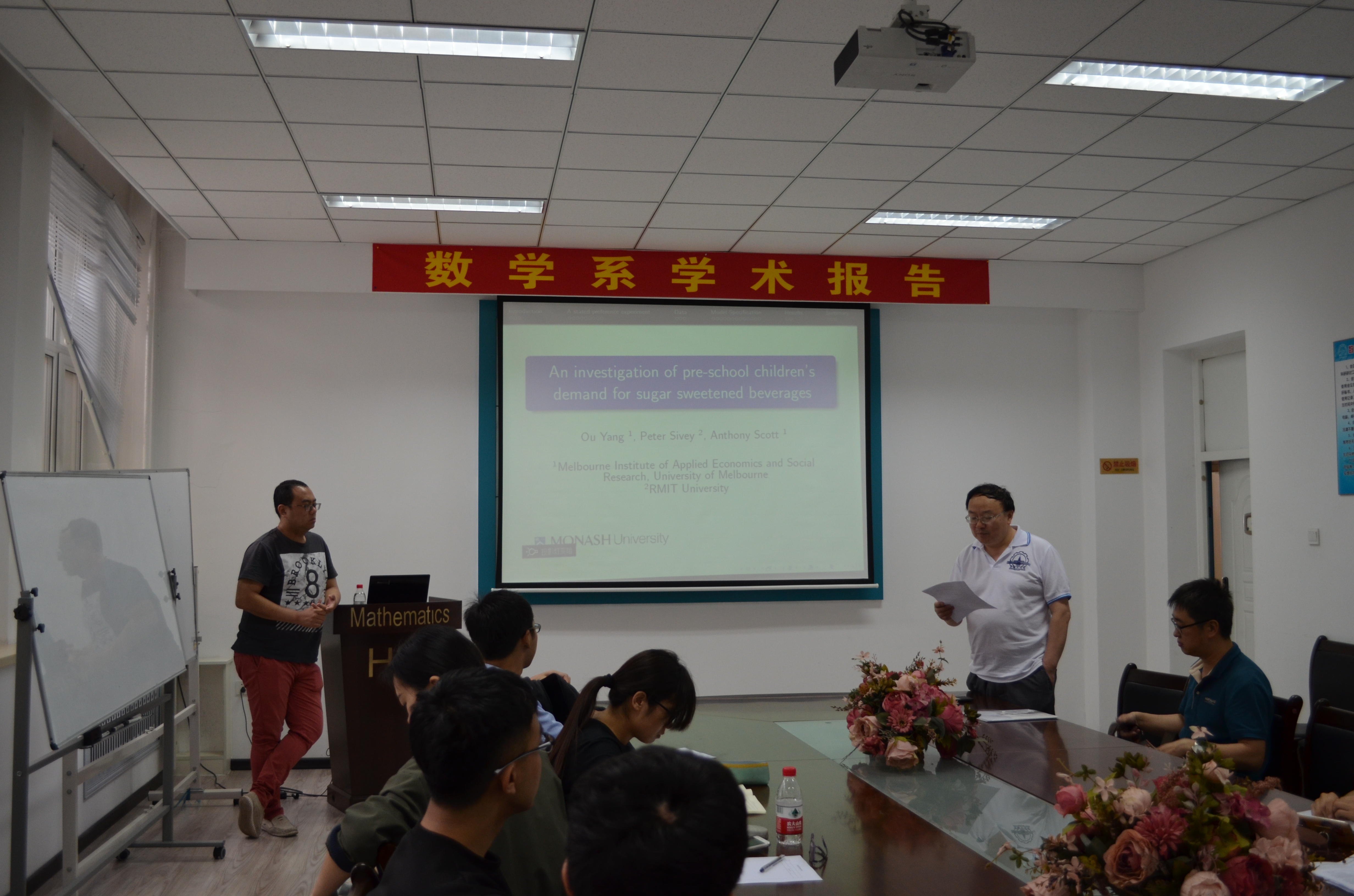 应bwin必赢数学系田波平教授邀请,墨尔本大学杨欧研究员于2017年6月15日至23日在bwin必赢数学系进行了学术访问,并于6月20日(周二)及21日(周三)两天上午10:00-11:30、下午15:00-16:30在格物楼503会议室作了四个学术报告,报告题目分别为:1. Environmental policy stringency and industrial productivity growth: An varying coecient cost function approach;2. Alcohol Tax Reform, Binge Drinking and Antisocial/Unlawful Behaviours;3.An investigation of pre-school children’s demand for sugar sweetened beverages;4.浅谈墨尔本大学本科生与研究生教育。报告由田波平教授主持,数学系及来访数学系交流的泰国师生听取了报告,并进行了热烈的讨论。