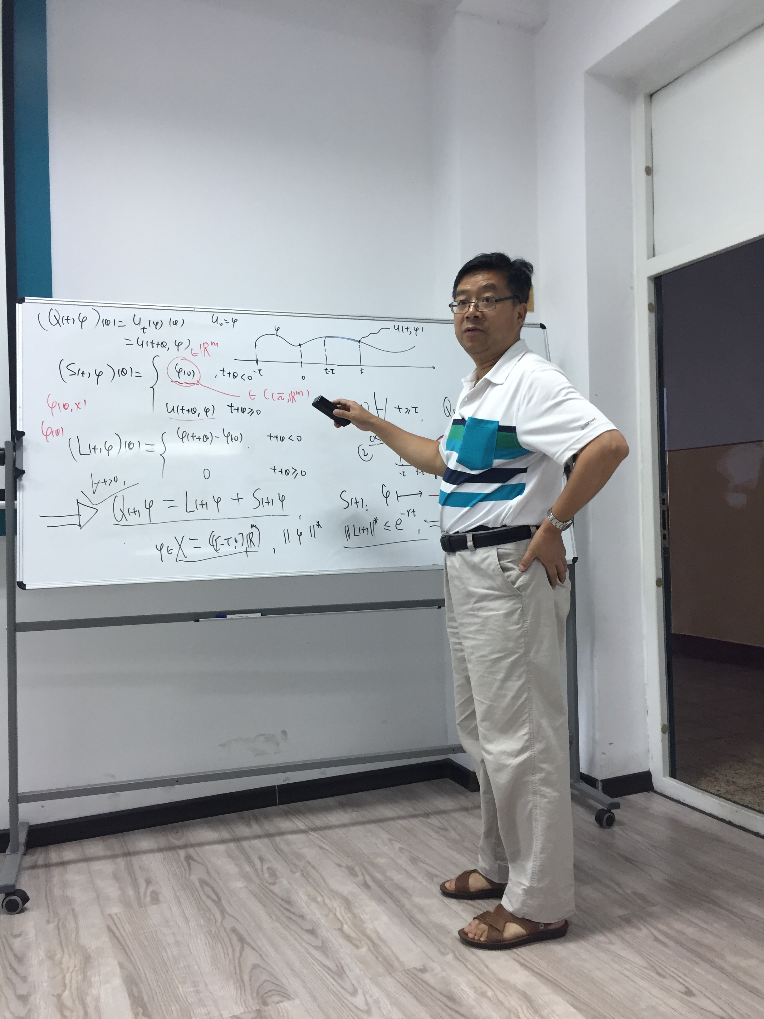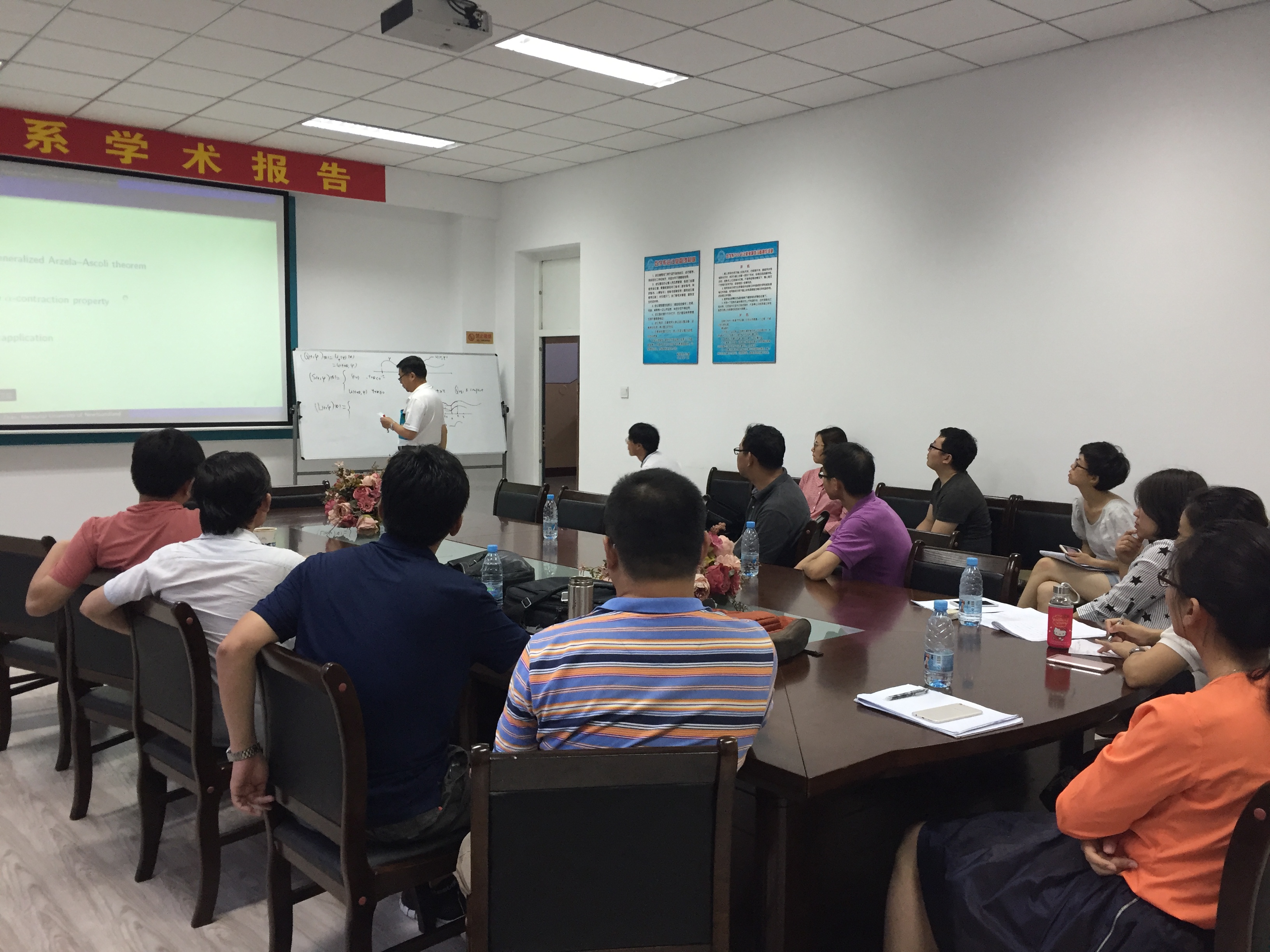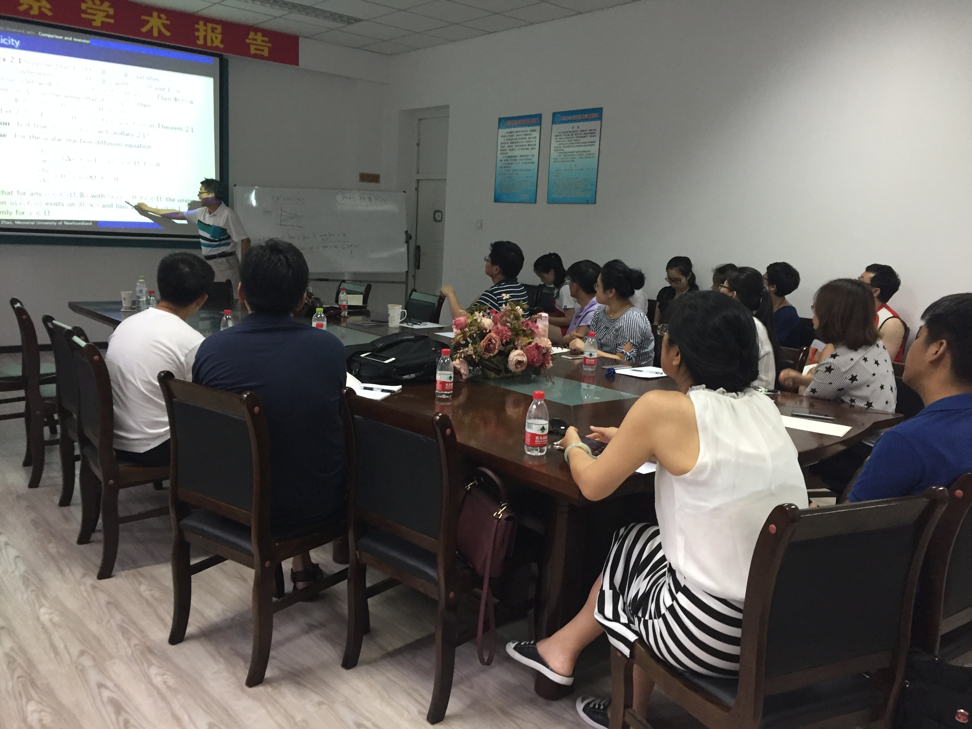 受国际合作处的资助,作为数学系SCI期刊编委校园行活动一部分,著名应用动力系统专家、加拿大纽芬兰纪念大学赵晓强教授应蒋卫华教授的邀请,于2017年7月1日至14日在bwin必赢数学系做访问交流。 赵晓强教授以反应扩散方程和动力系统研究中的几个热点问题为主题,在7日、9日、11日下午14:00-17:00,分别从反应扩散方程解的存在唯一性、正不变性、有界性、单调性等基本性质,稳定性与主特征值,吸引子和持久性,基本再生数,抽象泛函微分方程解映射的紧性等方面做了六个精彩的学术报告。报告由蒋卫华教授主持,相关专业的四十余位师生有幸参与讲座和讨论,报告也吸引了包括哈尔滨工程大学、哈尔滨师范大学、黑龙江大学、哈尔滨理工大学和东北林业大学的多位师生慕名前来参加。赵老师的系列报告系统、全面、细致、深入,师生们从中收获颇丰。
