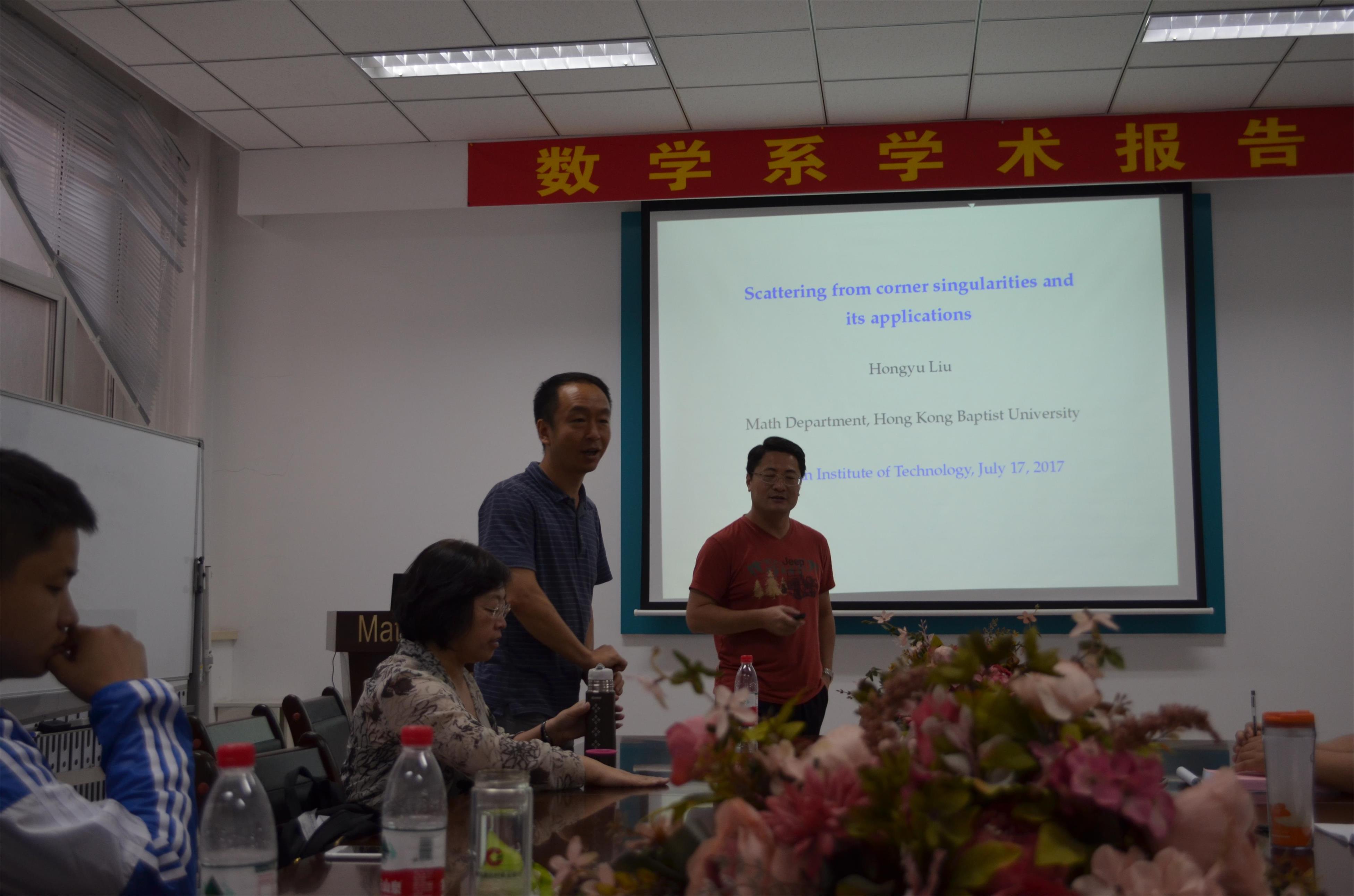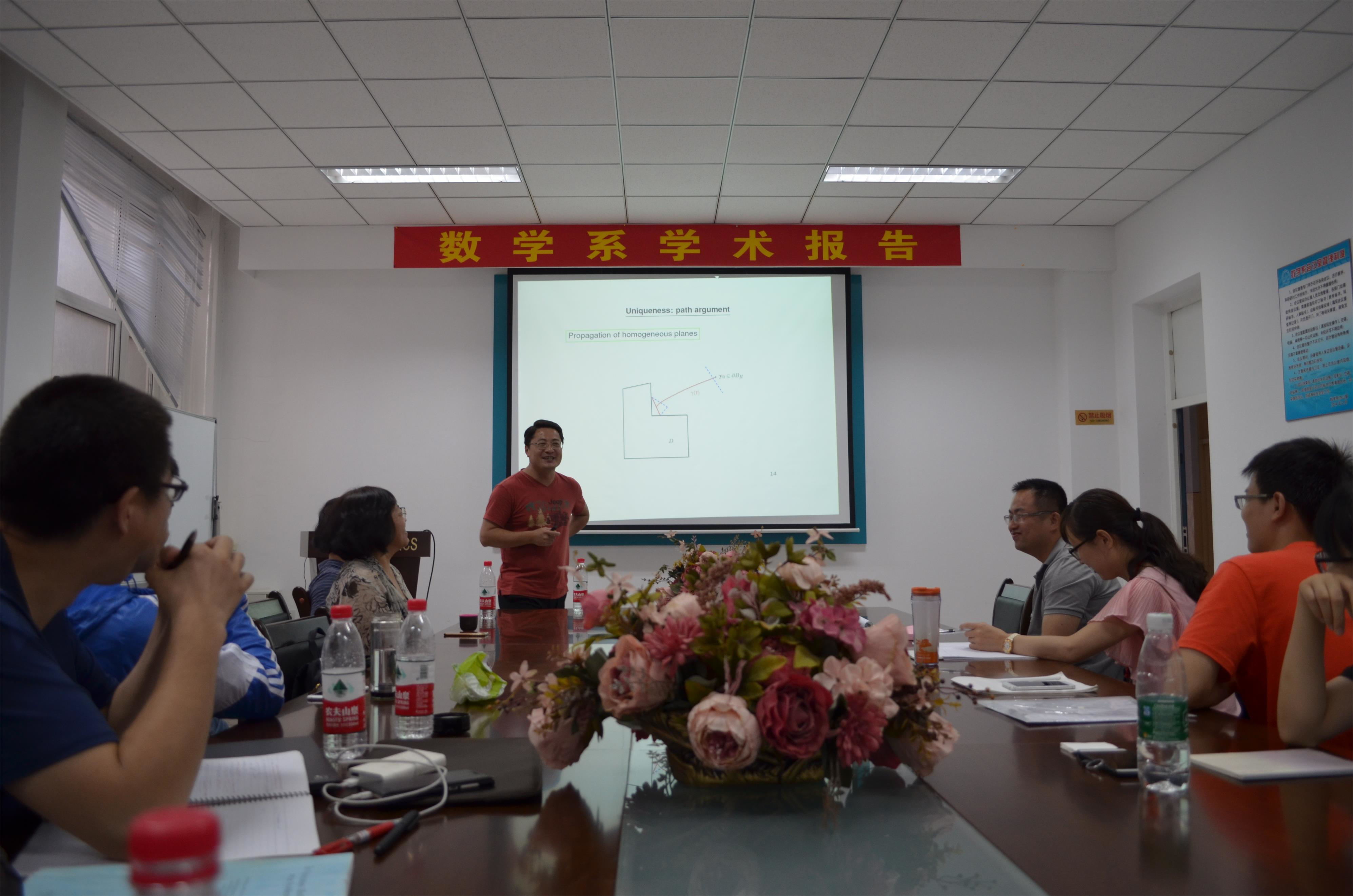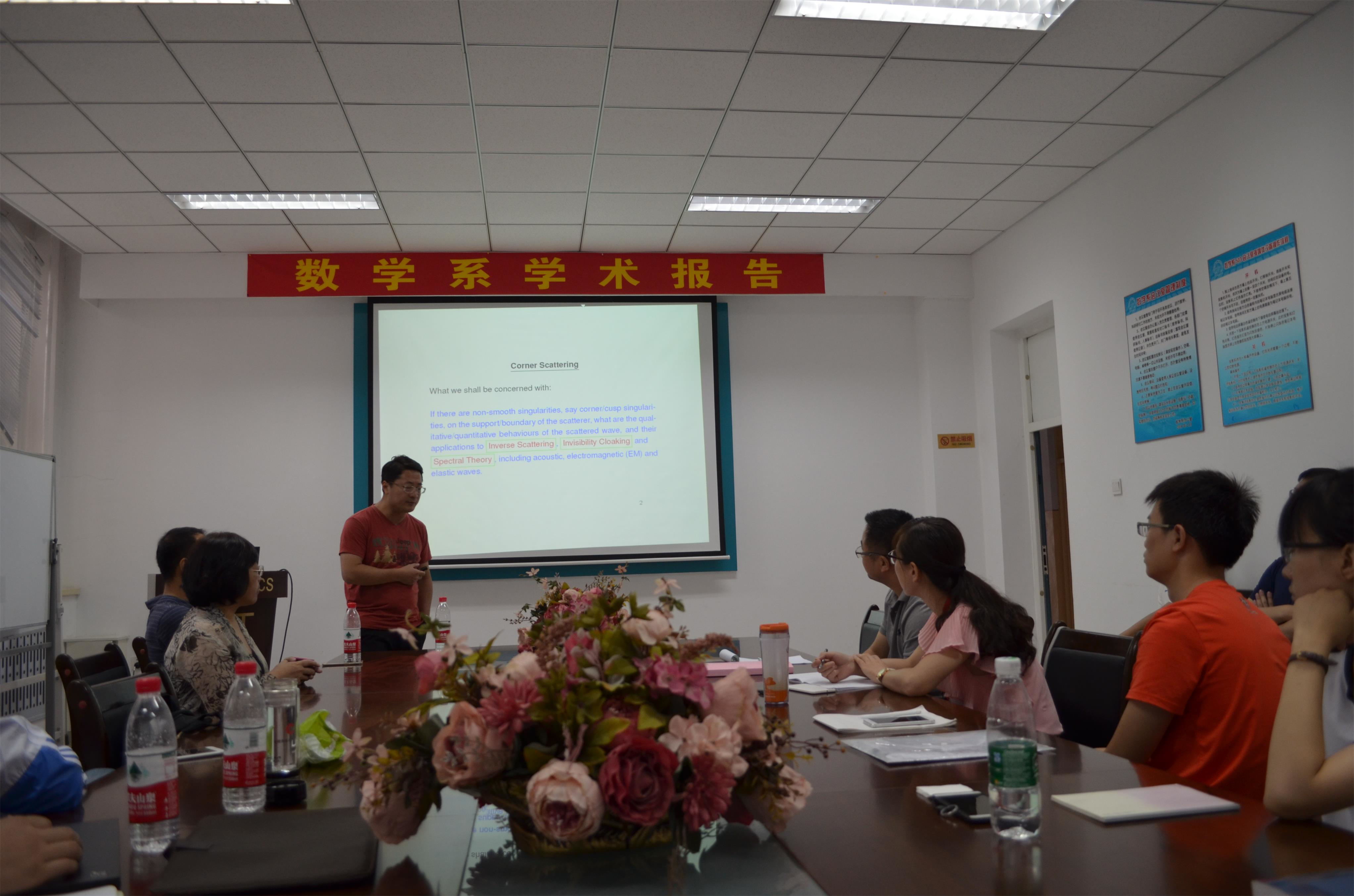 应数学系宋明辉教授的邀请,香港浸会大学理公司刘宏宇副教授以电磁散射中的反问题、等离子体共振等为主题,于7月17日(周一)—7月20日(周四)上午在格物楼503会议室做了精彩的报告。报告前宋明辉教授为大家介绍了刘宏宇副教授,并为本次报告的主题进行了简要概述和背景介绍。刘宏宇教授为香港中文大学理学博士,现任香港浸会大学数学系副教授,代表性研究方向为电磁散射中的反问题、隐形涂层、弹性材料中等离子激发等。 报告分别从非光滑的奇异点散射现象及其应用、基于弹性波理论的等离子共振现象、源与介质的同时恢复等方面做了四个精彩的学术报告。报告由宋明辉教授主持,相关专业的二十余位师生参加讲座和讨论。报告也吸引了黑龙江大学、东北师范大学、哈尔滨理工大学的师生慕名前来参加。刘老师的系列报告系统、全面、细致、深入,师生们从中不仅可以了解到相关领域的前沿工作,更对自己接下来的工作学习方向有了更为清晰的认识,收获颇丰。