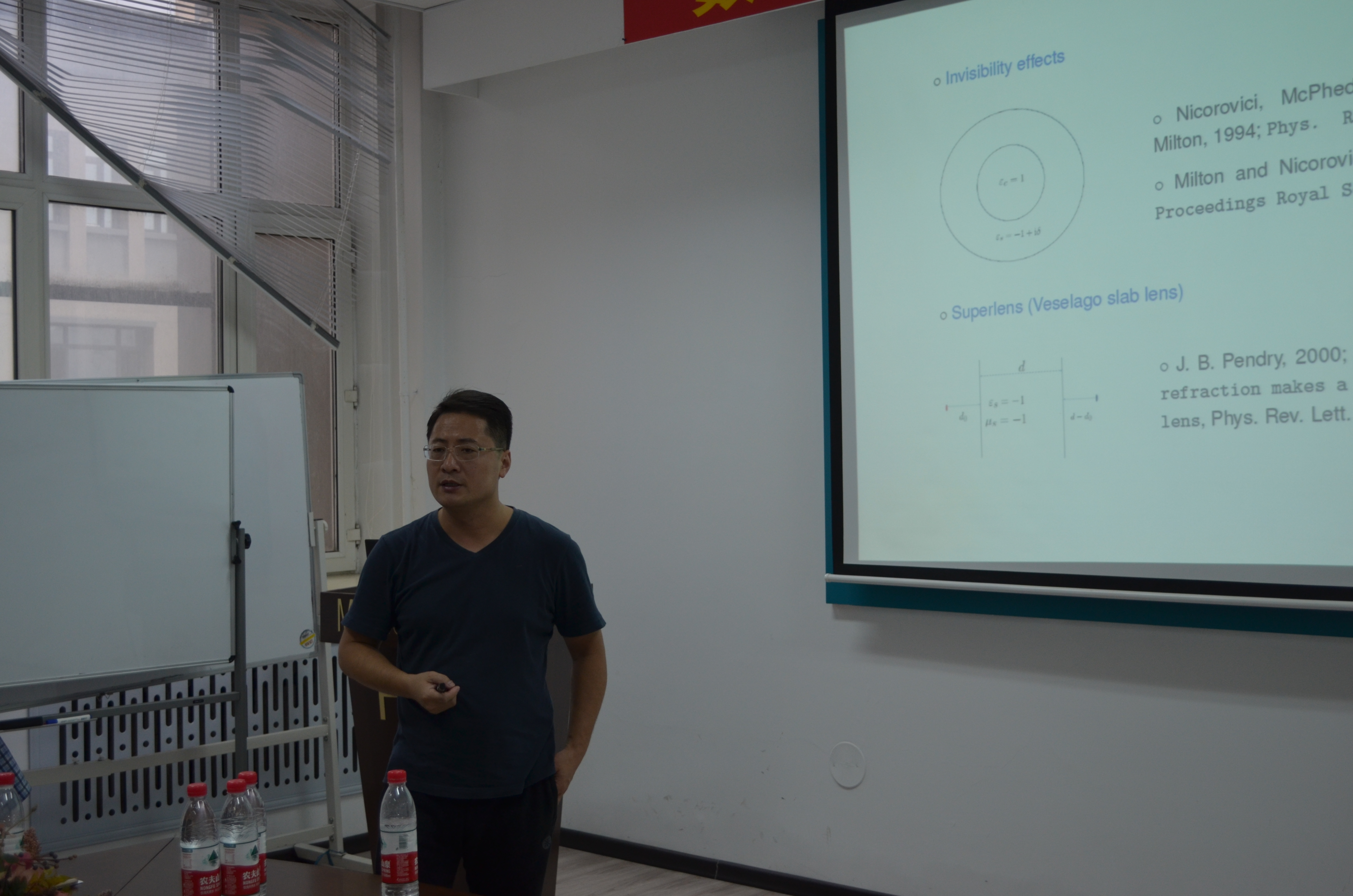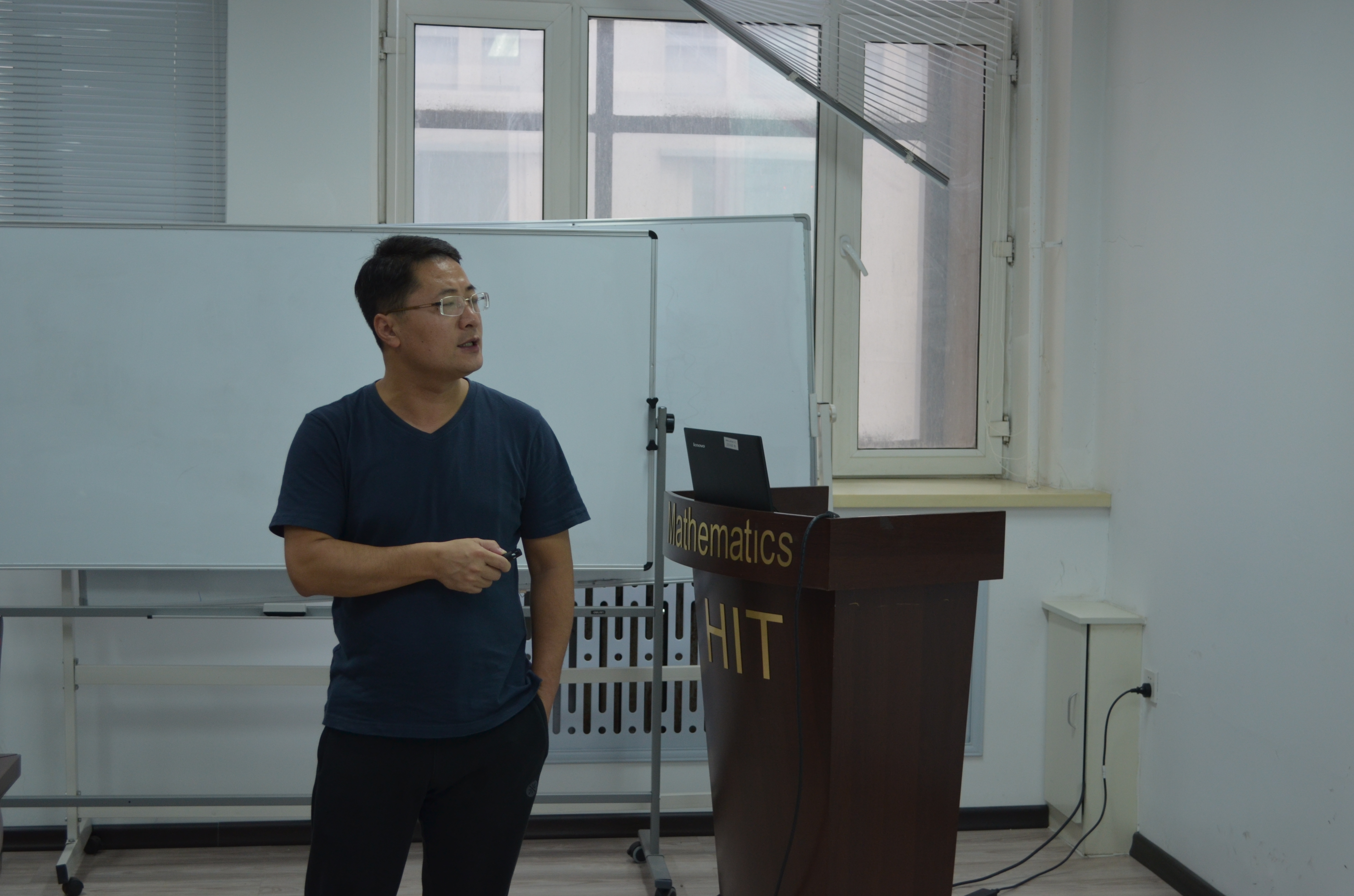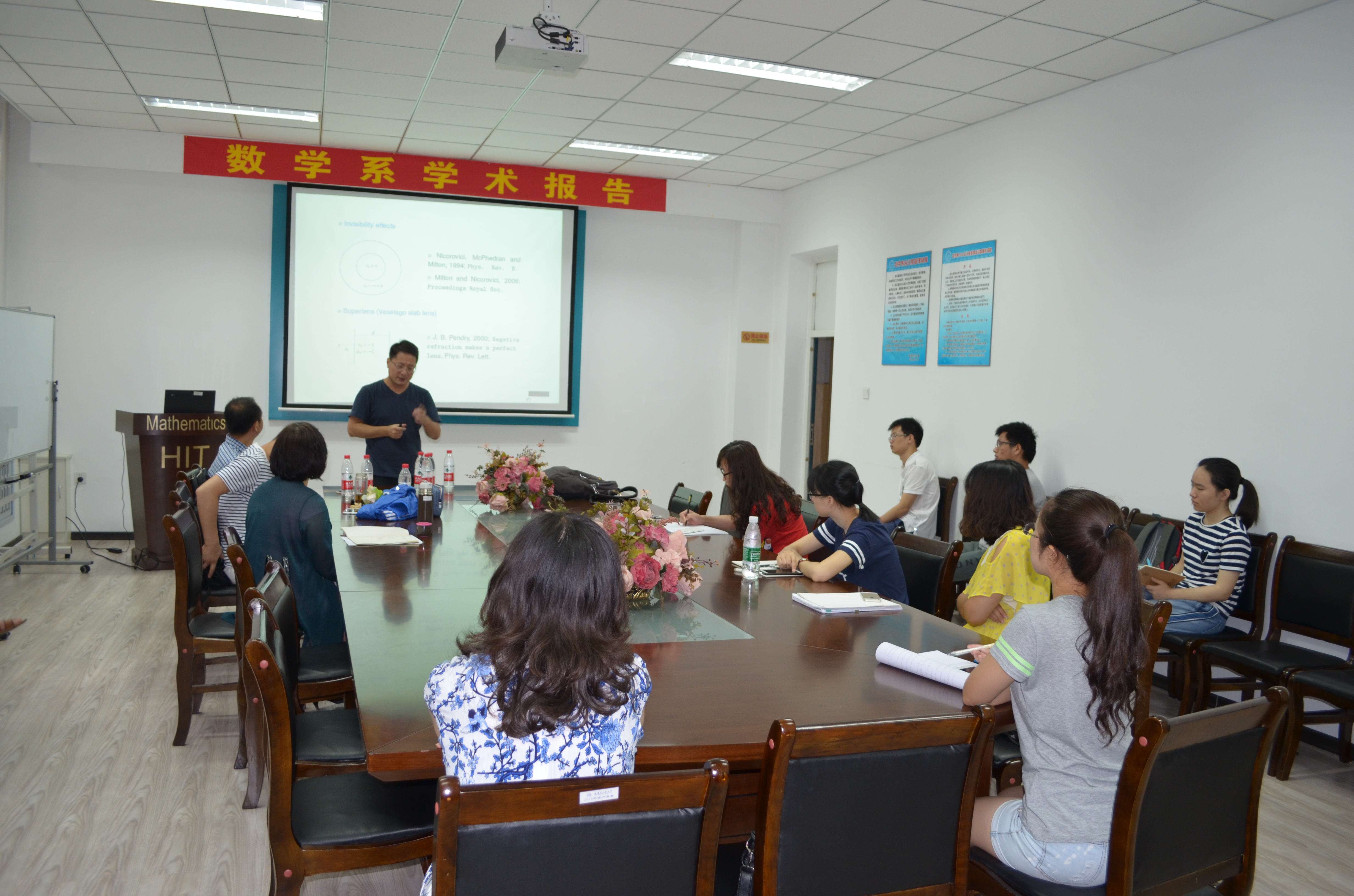 应数学系宋明辉教授的邀请,香港浸会大学理公司刘宏宇副教授以电磁散射中的反问题、等离子体共振等为主题,于7月17日(周一)—7月20日(周四)上午在格物楼503会议室做了精彩的报告。报告前宋明辉教授为大家介绍了刘宏宇副教授,并为本次报告的主题进行了简要概述和背景介绍。刘宏宇教授为香港中文大学理学博士,现任香港浸会大学数学系副教授,代表性研究方向为电磁散射中的反问题、隐形涂层、弹性材料中等离子激发等。 报告分别从非光滑的奇异点散射现象及其应用、基于弹性波理论的等离子共振现象、源与介质的同时恢复等方面做了四个精彩的学术报告。报告由宋明辉教授主持,相关专业的二十余位师生参加讲座和讨论。报告也吸引了黑龙江大学、东北师范大学、哈尔滨理工大学的师生慕名前来参加。刘老师的系列报告系统、全面、细致、深入,师生们从中不仅可以了解到相关领域的前沿工作,更对自己接下来的工作学习方向有了更为清晰的认识,收获颇丰。
