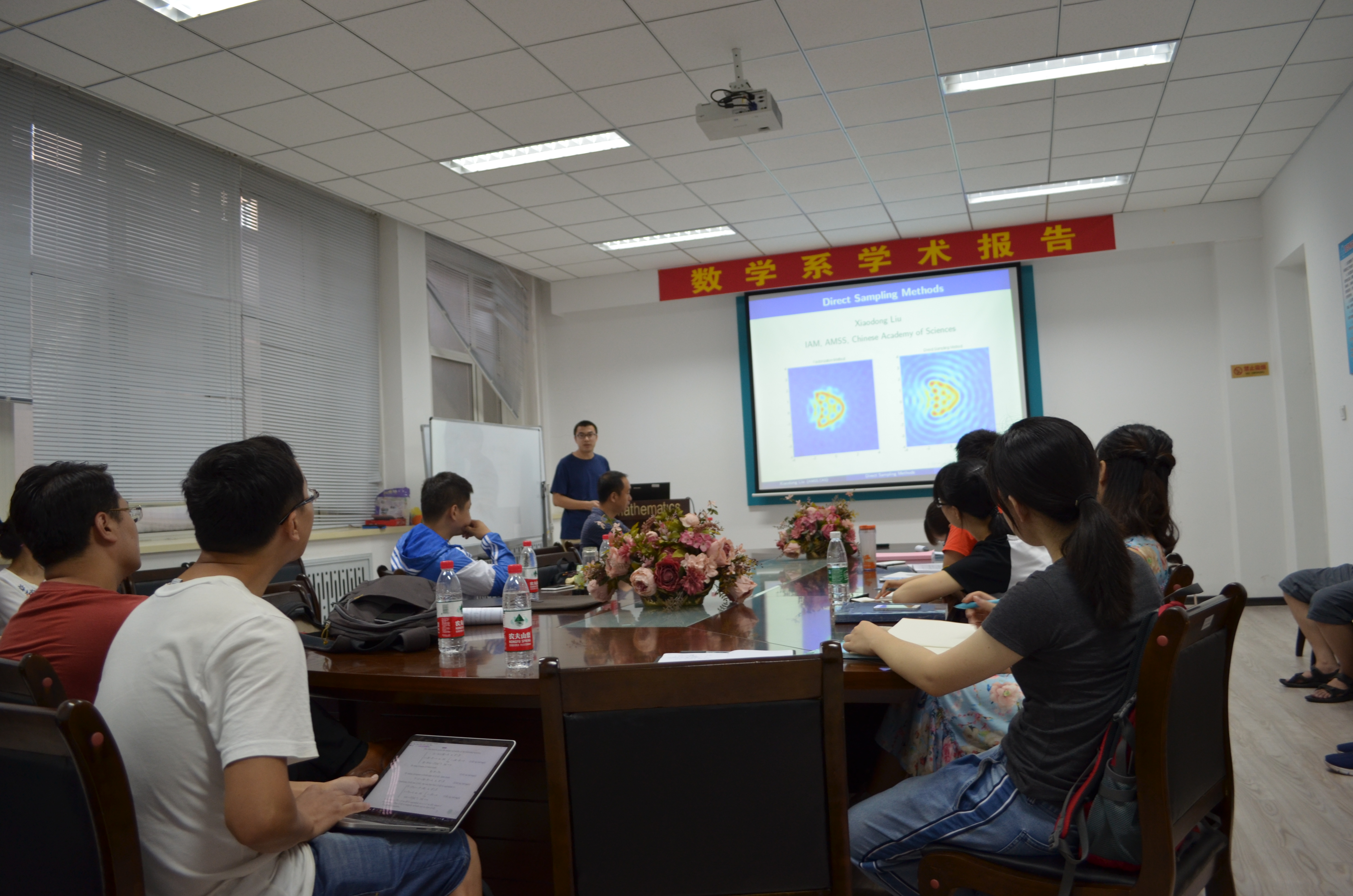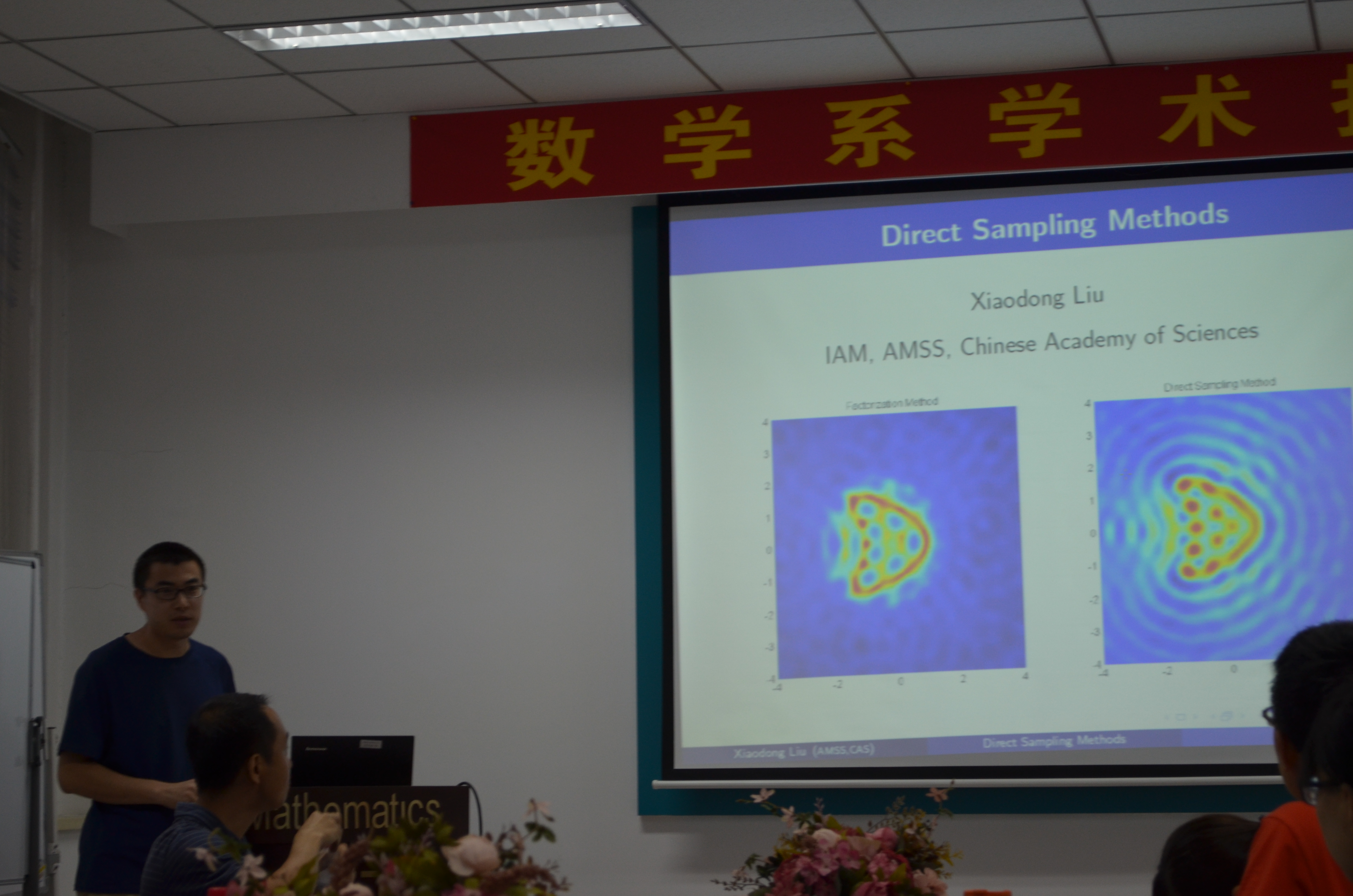 应数学系郭玉坤副教授的邀请,2017年7月10日至7月19日期间,中国科公司数学与系统科学研究院应用数学所刘晓东副研究员来我校访问,与数学系部分师生就反问题数值计算等问题进行了交流。7月17日上午8:30至9:15,刘晓东老师在格物楼503数学系报告厅做了一场《关于反问题计算中的直接采样算法》的学术报告。刘老师的报告系统深入地介绍了反散射理论的若干前沿热点问题及各种采样算法的基本思想。报告由郭玉坤副教授主持,相关专业的二十余位师生参加了讲座并进行了热烈讨论。