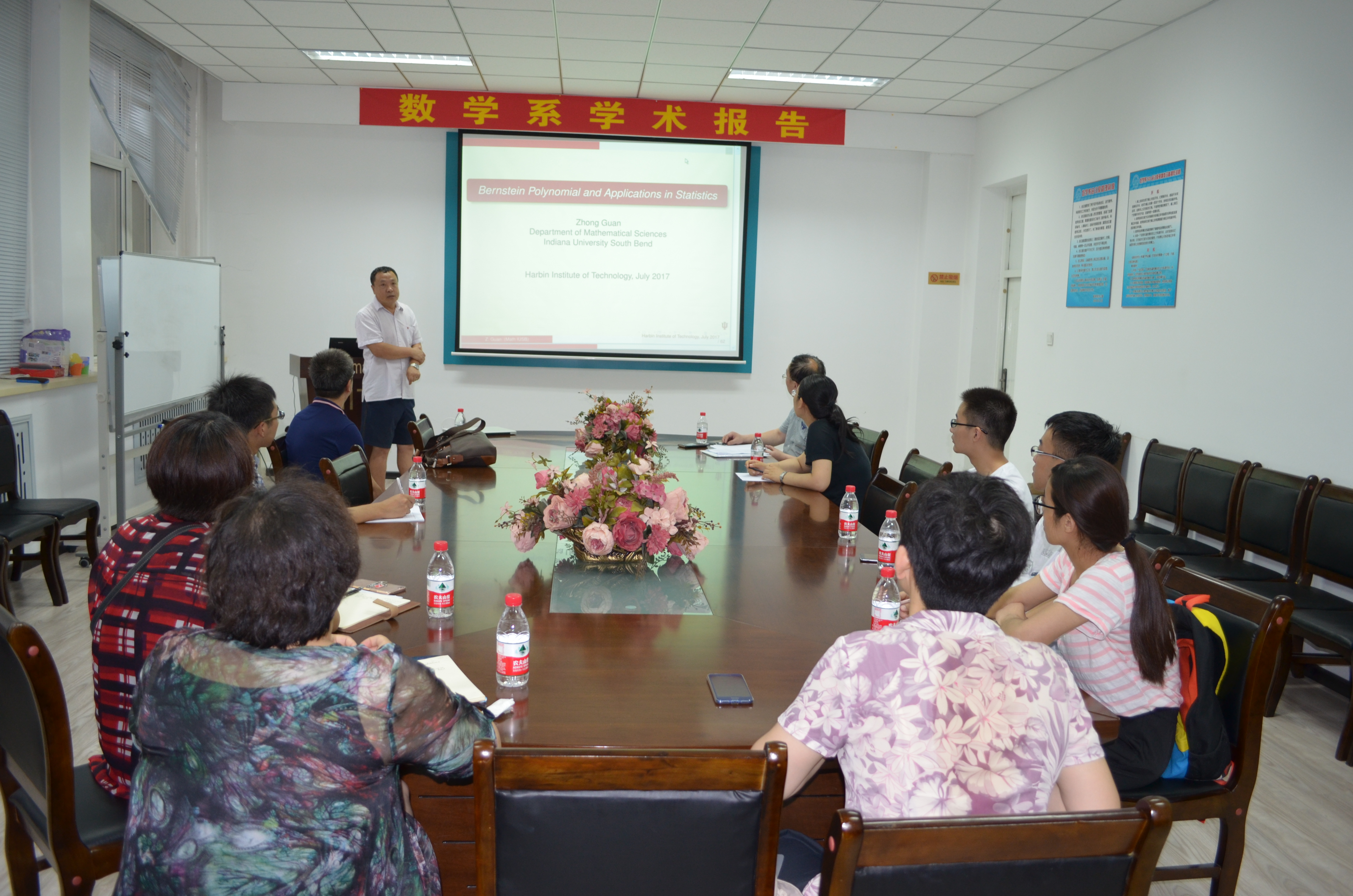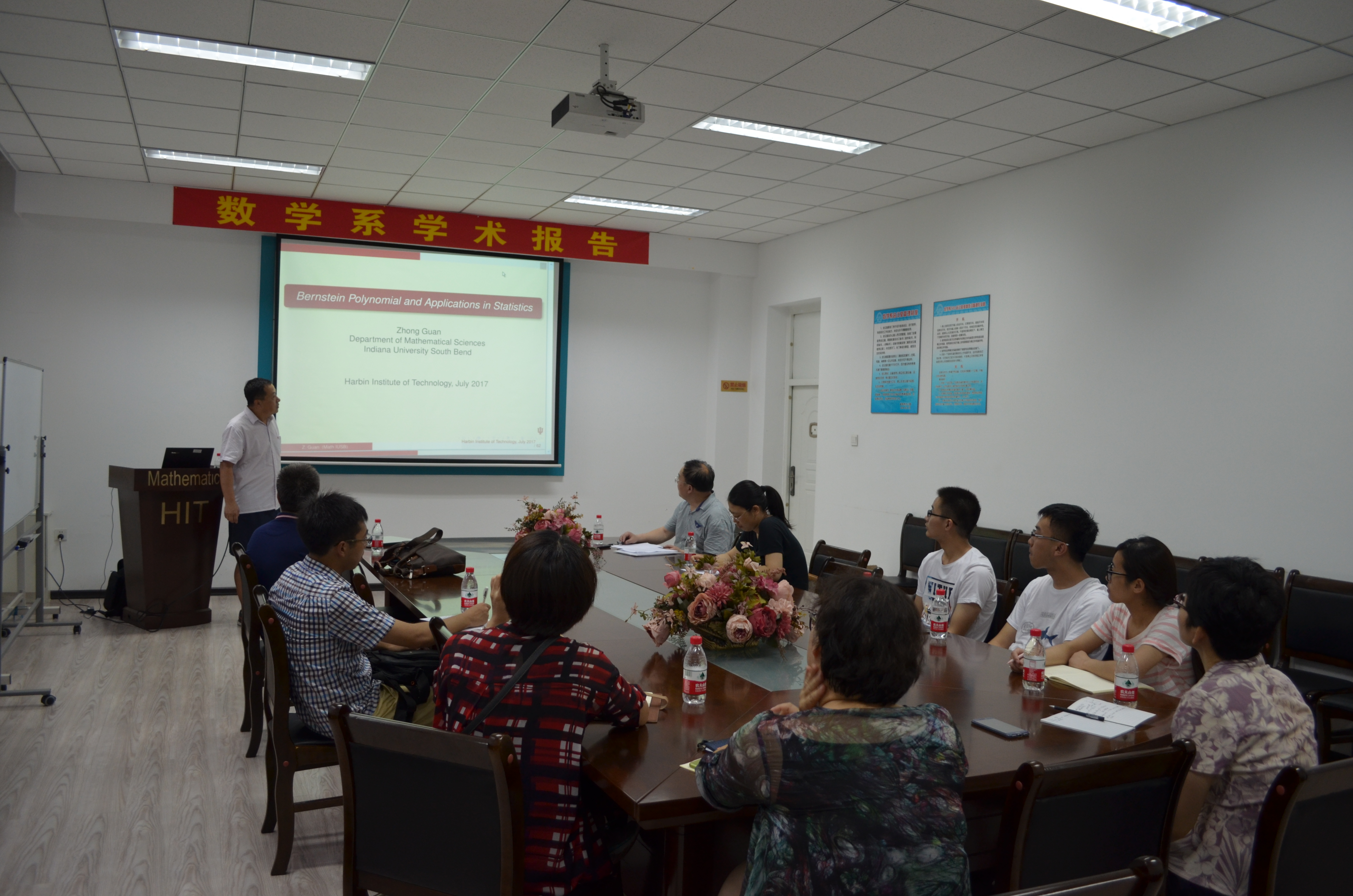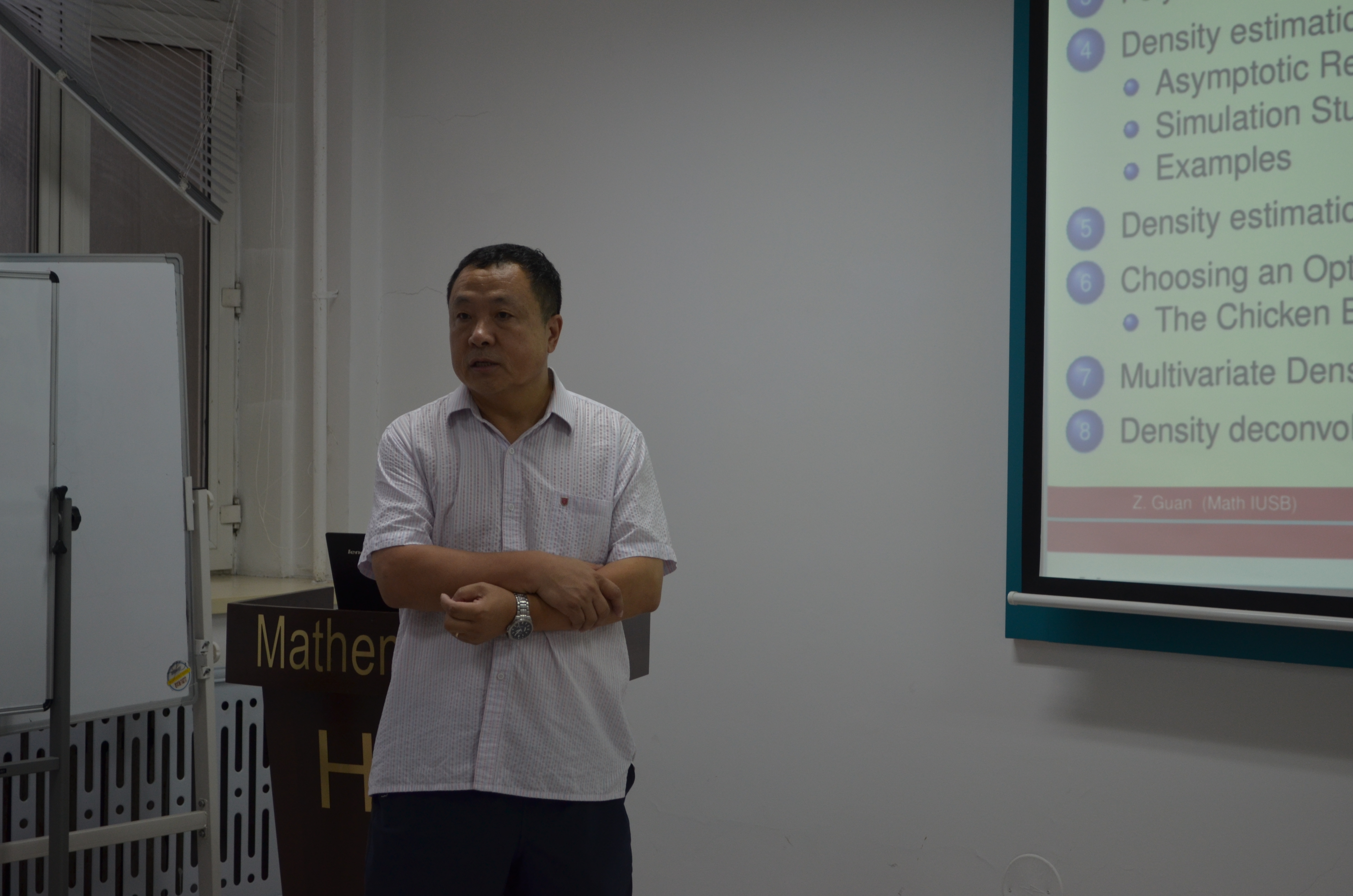 应数学系田波平教授邀请,美国印第安纳大学南本德分校关忠教授访问数学系并作报告。关忠教授于2017717 下午14:00--17:002017719 上午9:00--12:00分别在格物楼503和正心楼111报告厅,分别作了:Optimal Combination of Biomarkers for Time-dependent ROC Estimation and Related ProblemsIntroduction to Bernstein polynomial and iterated Bernstein polynomialPolynomial with positive coefficients--another generalization of Bernstein polynomialMultivariate polynomial with positive coefficients and it's applications in statistics的四个报告。报告由田波平教授主持,数学系10余位师生听取了报告,并进行了热烈的讨论。