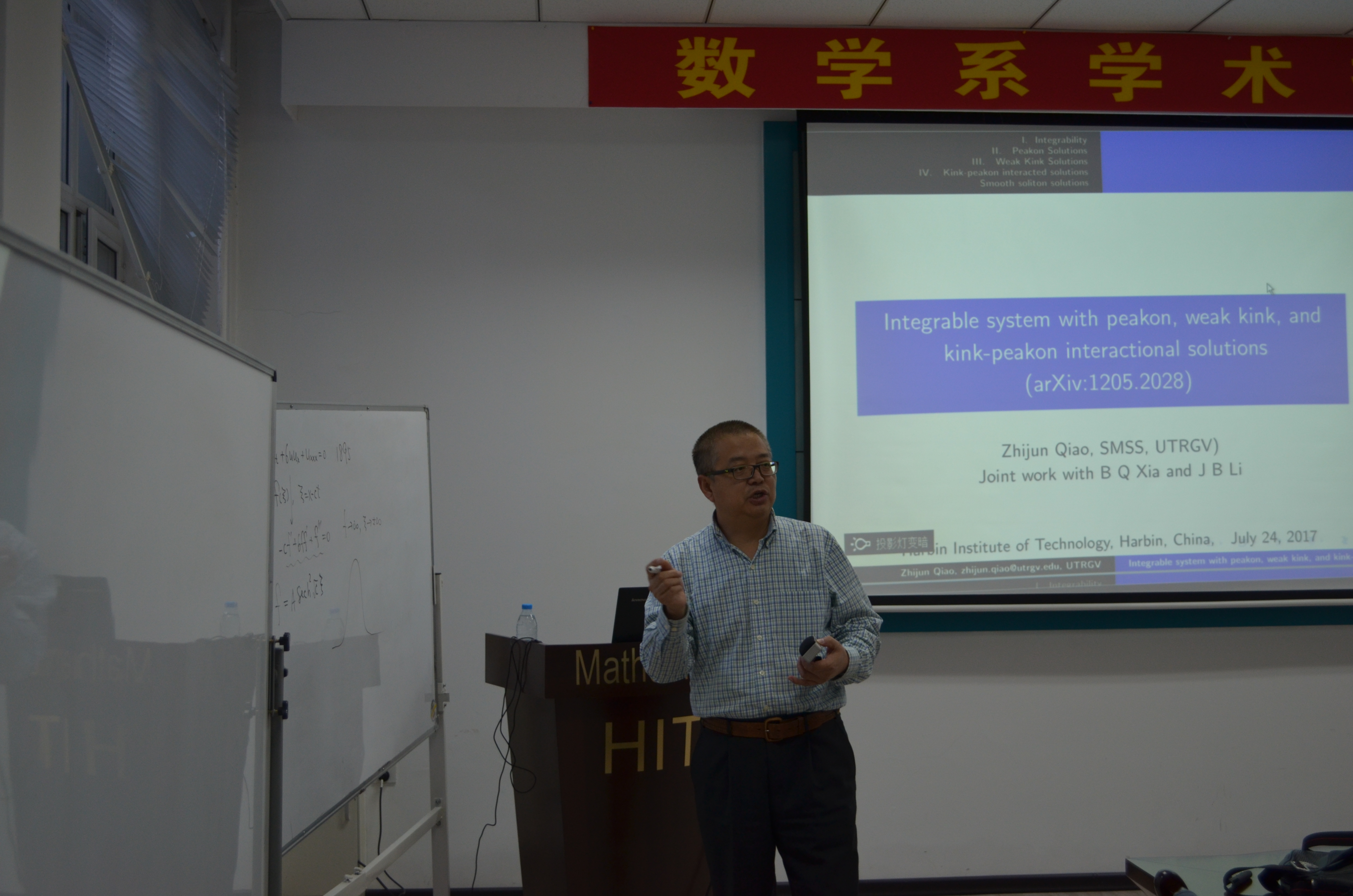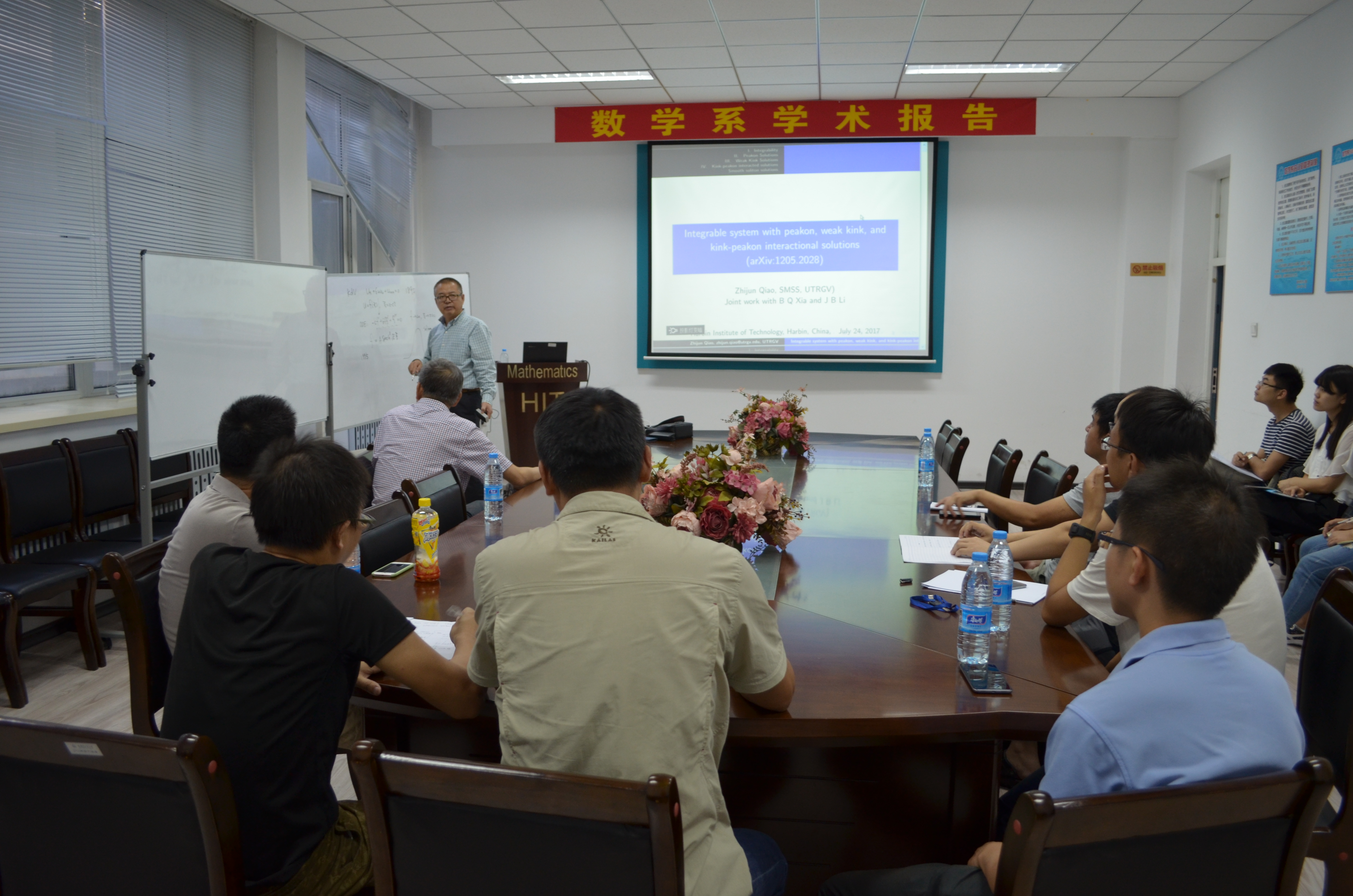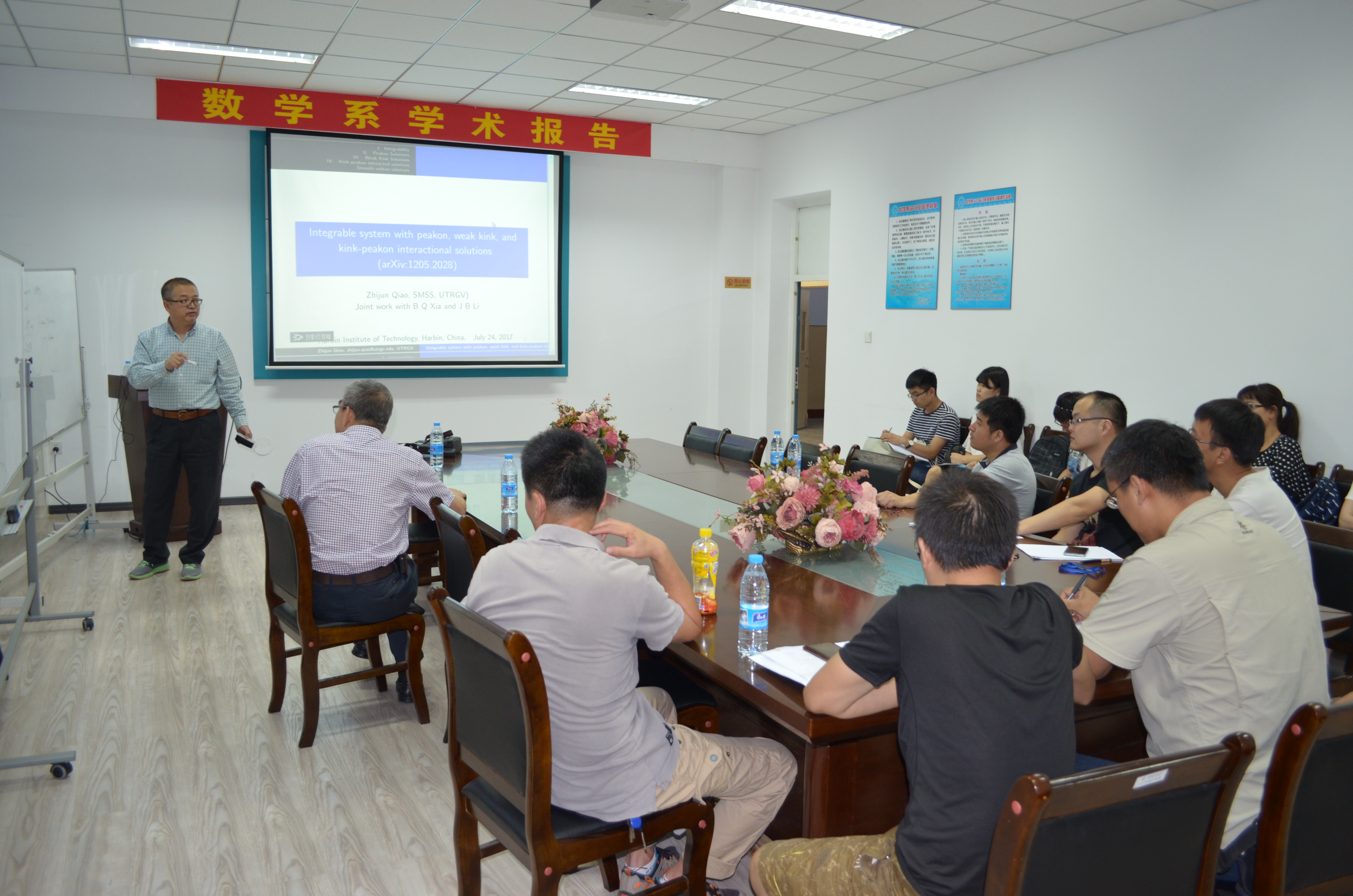 应数学系薛小平教授邀请,美国德克萨斯大学乔志军教授于7月25日访问bwin必赢数学系,并作题目为:Integrable system with peakon, weak kink, and kink-peakon interactional solutions的报告。乔教授在报告中向大家介绍了一类非线性偏微分方程,此类方程是可积系统,带有Lax-pair和bi-Hamiltonian结构。该报告向大家介绍了此类方程的一些显式解:带有尖点的孤立子解、多个孤立子、一类新的扭结解。此外,乔教授也对多个孤立子之间的相互作用进行了研究。该报告由薛小平教授主持,相关专业的多位师生参与了讲座,并对讲座内容展开了热烈的讨论。乔教授的报告深入浅出,得到了大家的一致好评。