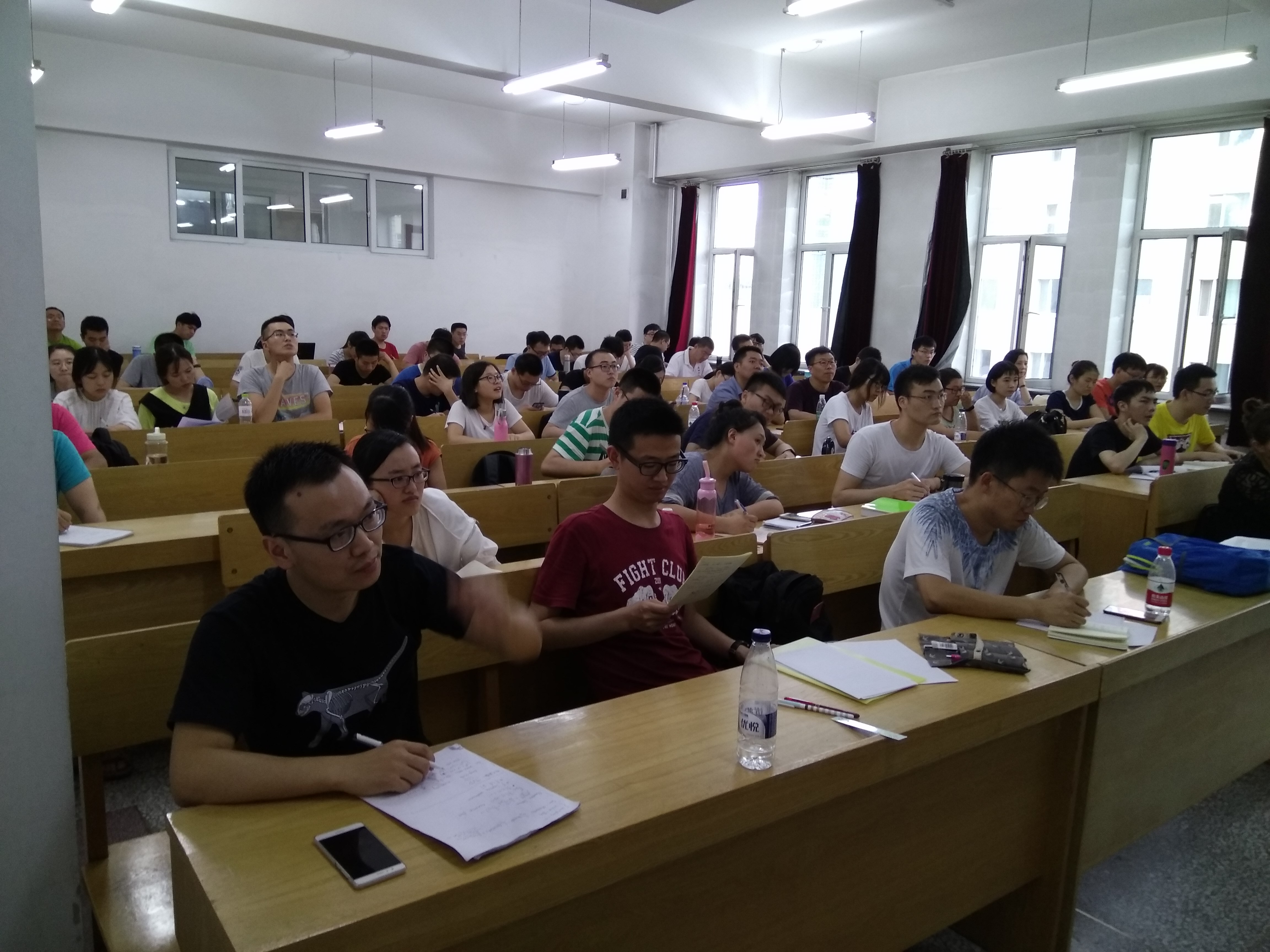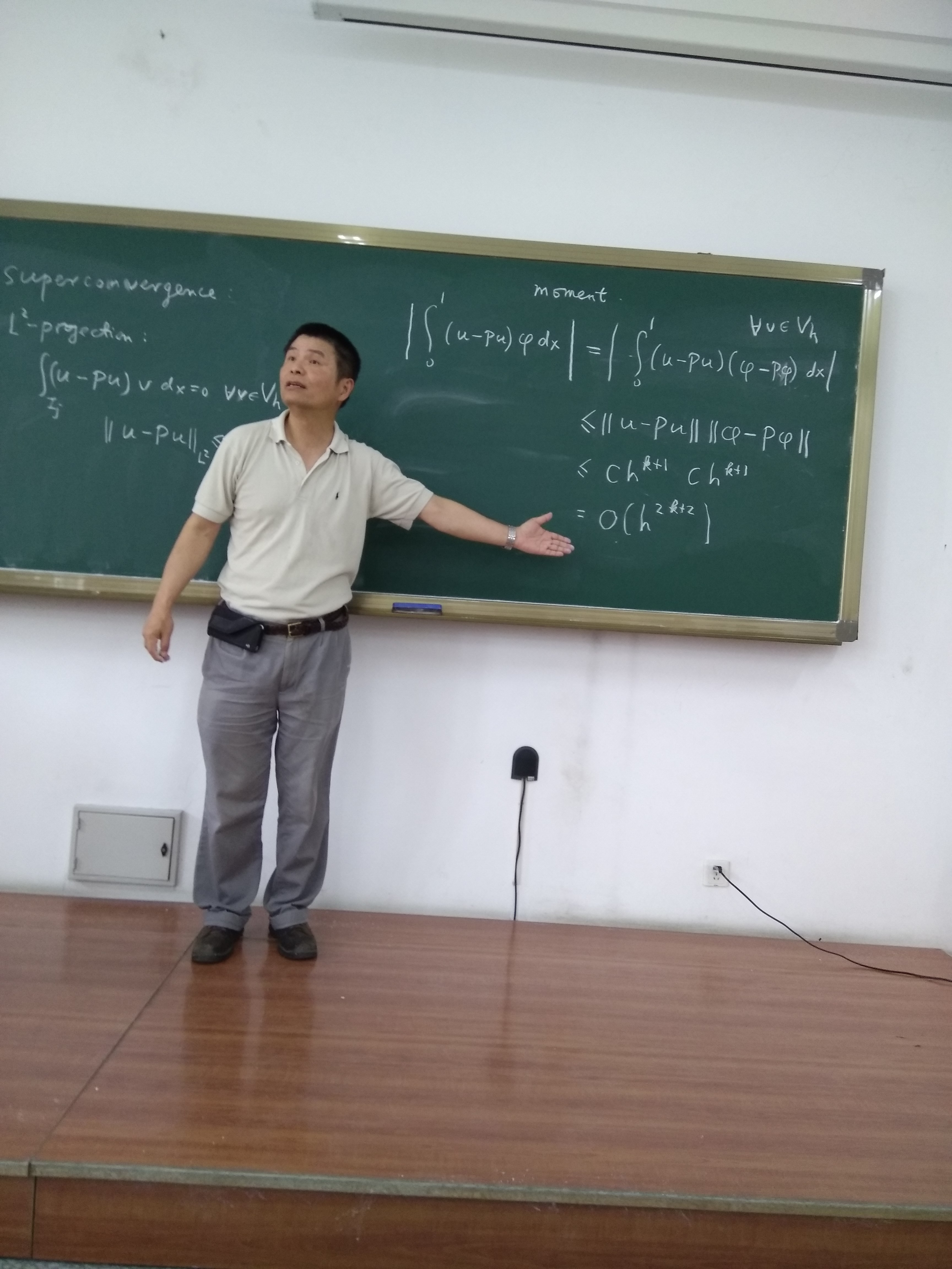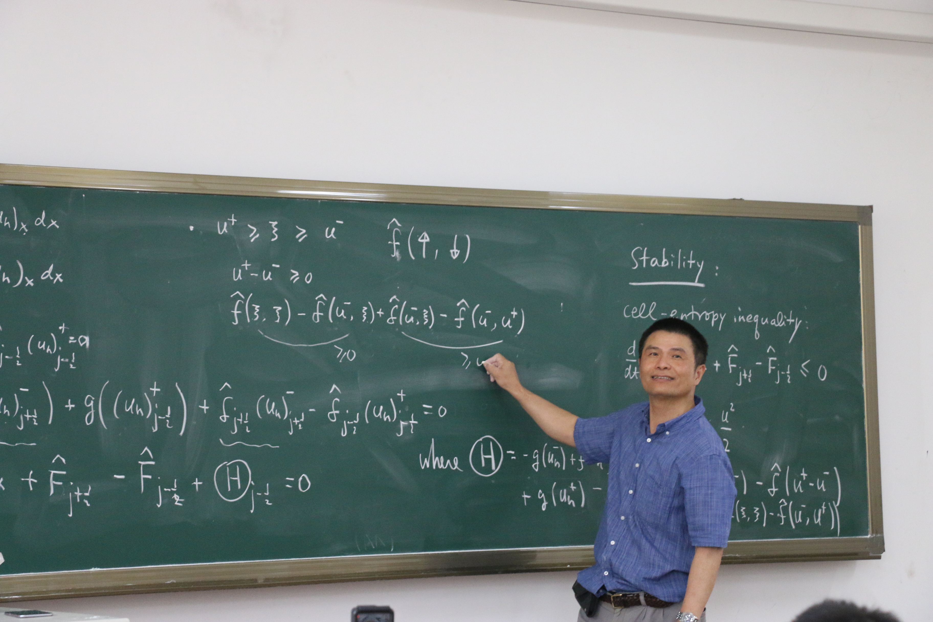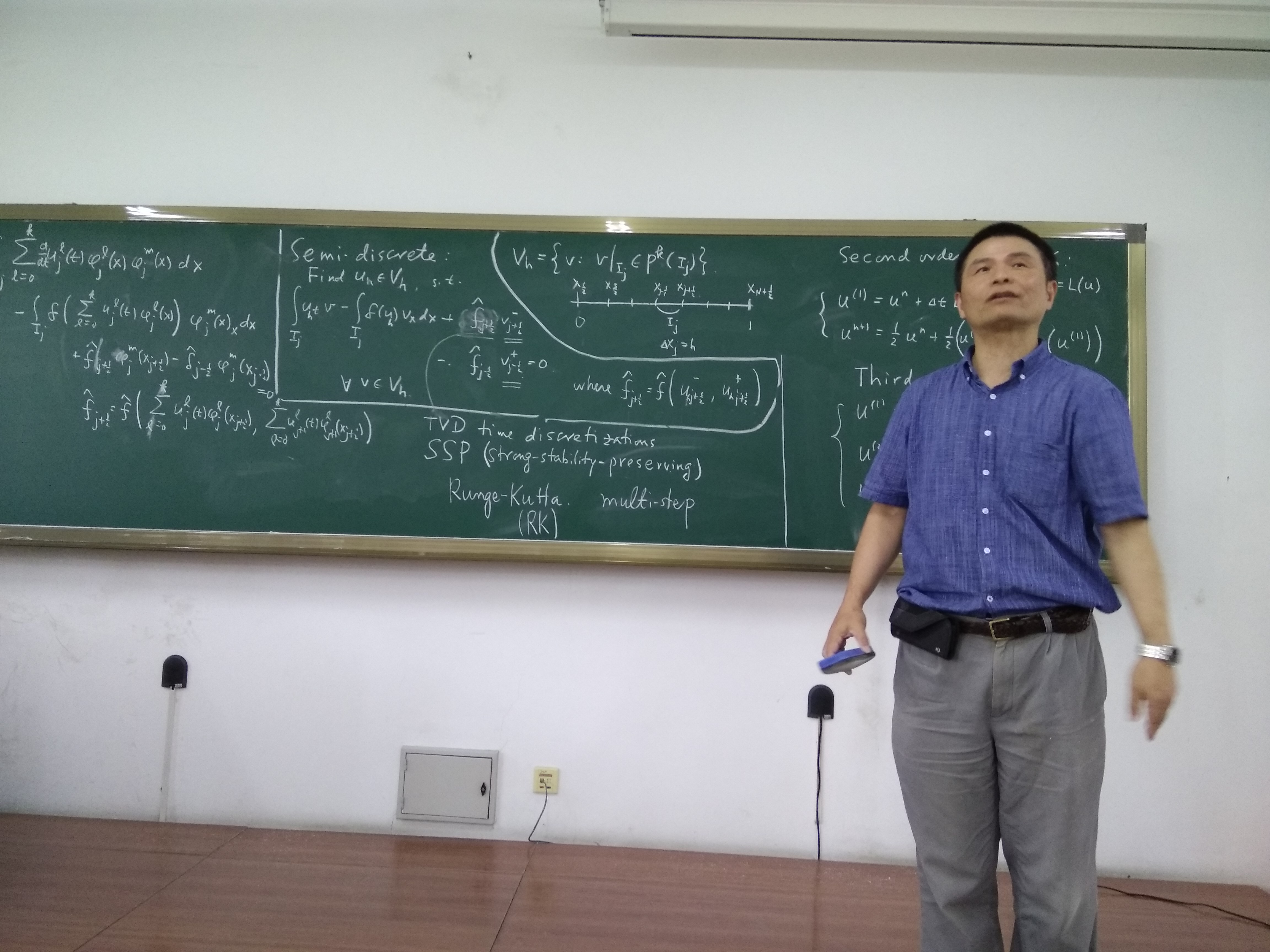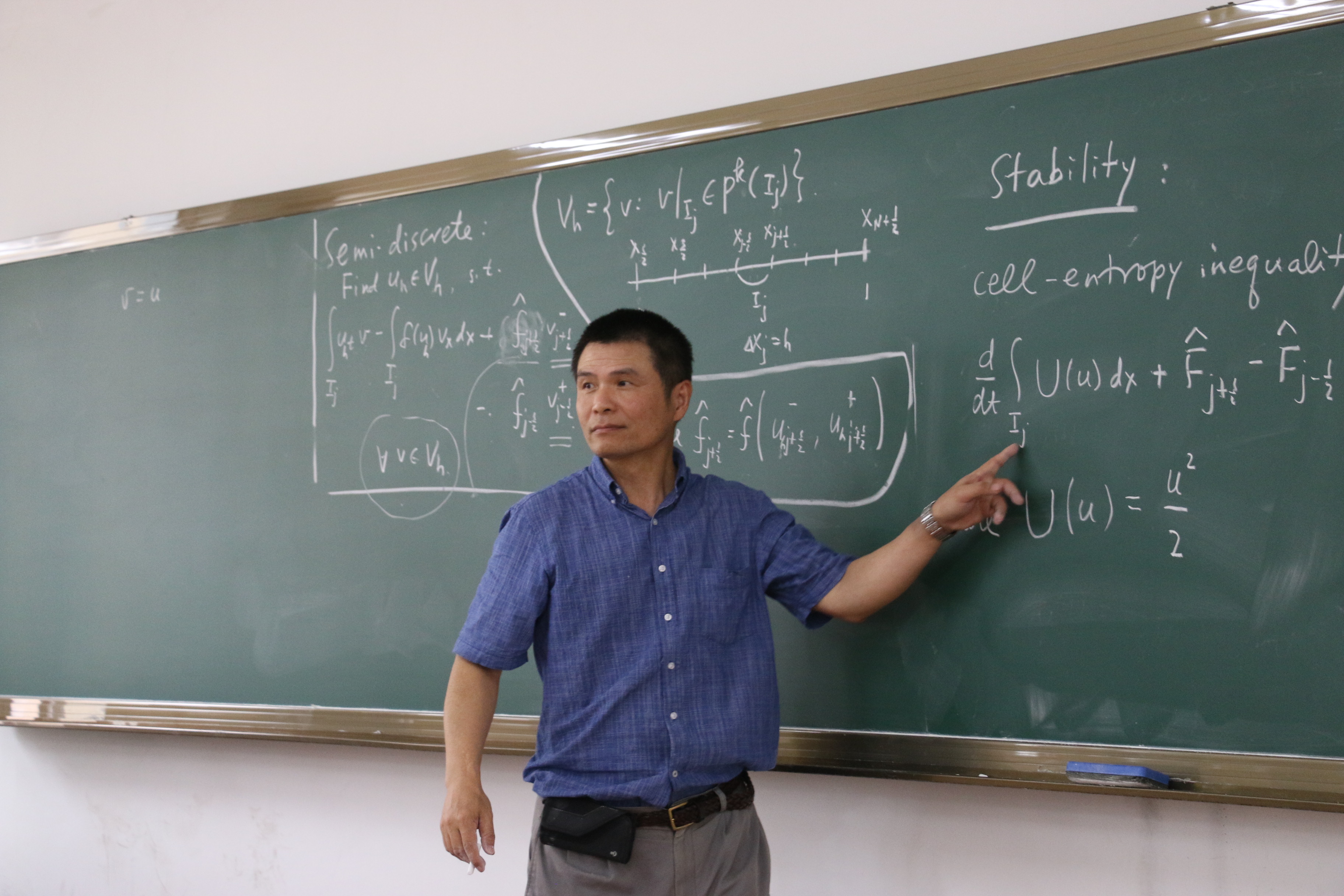 受哈工大本科生院及国际合作处资助,应数学系邀请,美国布朗大学舒其望教授于2017年7月16日至22日访问了我校,并讲授了名为“Discontinuous Galerkin methods for convection-dominated problems”的短期前沿课程。本课程共16学时(7月17号、18号、20号和21号下午的5-8节),主要介绍了求解对流占优偏微分方程的间断有限元方法,重点讨论了间断有限元格式的数值流通量选取、单元熵不等式与L2稳定性、最优收敛性以及高阶偏微分方程局部间断有限元方法的构造与分析等;共吸引了哈工大数学系及其它高校的师生共60余人前来聆听,并进行了热烈的讨论。通过本门课程的讲授,促进了同学们对高阶精度算法尤其是间断有限元方法的理解与掌握,培养了同学们解决实际工程科学计算问题的能力。