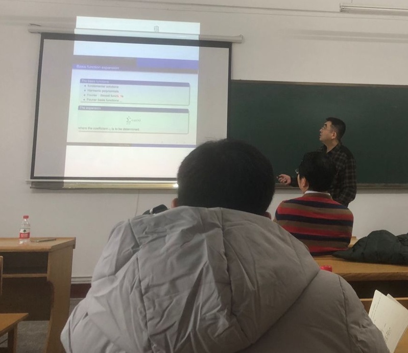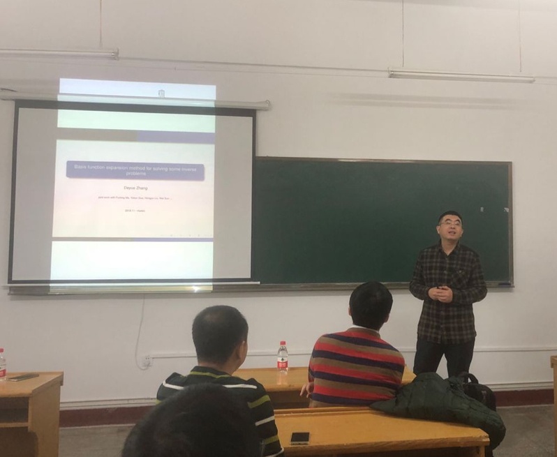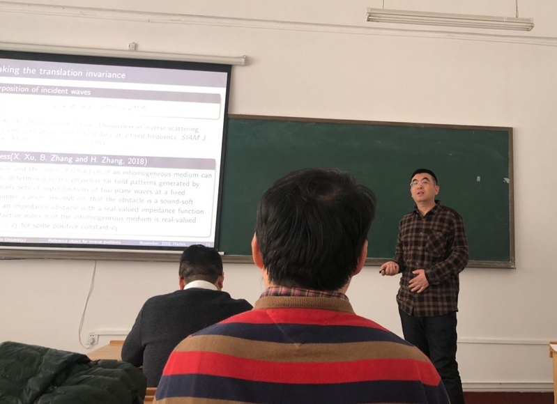应数学系郭玉坤副教授的邀请,吉林大学bwin必赢张德悦教授于2018年11月18日至20日到我校进行学术访问。张德悦教授分别于18日下午14:00-15:00和20日上午9:00-10:00在格物楼522报告厅做了两场学术讲座,报告内容涉及声波反散射问题、无相位数据问题的参考球技术、以及基函数展开法求解反问题的算法框架及其应用等课题。报告由郭玉坤副教授主持,数学系相关方向的师生参加了报告会并与张德悦教授进行了热烈的学术交流与讨论。