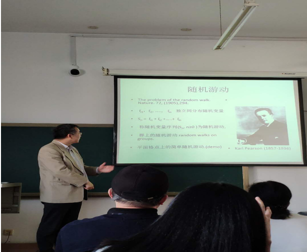 第一场报告时间为3月29日下午14:00-15:00,地点为正心楼308室。陈教授以“相互作用(无穷)粒子系统与随机游走”为题系统地介绍了相互作用粒子模型,作为概率与统计中一个极其重要的研究领域,无穷粒子系统是一类重要的马氏过程,具有广泛的应用背景。由于相互作用的原因,模型比较复杂,状态空间通常是无穷维的,研究手段很有限。陈教授从其导师T.M. Liggett的专著《Interacting particle systems》出发,介绍无穷粒子系统的背景,研究方法及发展现状,以选举模型,排他过程和接触过程为例,围绕存在性及极限性质将其转化为马氏链随机游走的相遇问题,通过与简单随机游动的比较给出了模型的一些性质。