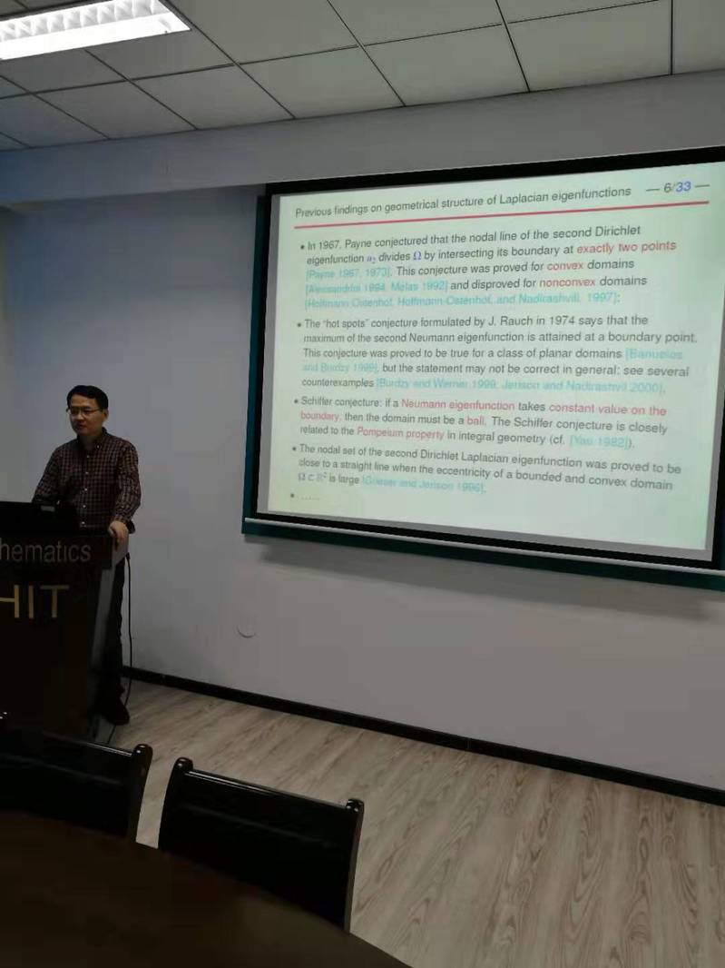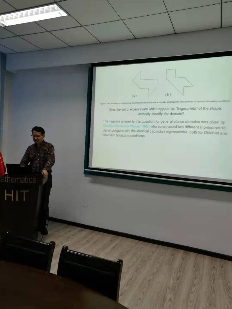 应bwin必赢郭玉坤副教授邀请,东北师范大学数学与统计公司刁怀安副教授于近期访问了我校,并于2019年10月31日上午11:00-12:00在格物楼503报告厅进行了一场学术讲座。刁老师以On nodal and generalized singular structures of Laplacian eigenfunctions and applications to inverse scattering problems为主题为我校师生做了一场精彩的学术报告,介绍了拉普拉斯算子特征函数在反散射问题上的应用。报告由郭玉坤副教授主持,bwin必赢的师生在报告现场与刁老师进行了热烈的交流与讨论。
