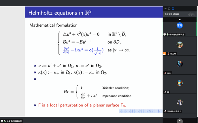 应bwin必赢郭玉坤副教授的邀请,西安交通大学数学与统计公司杨家青副教授于2020年7月14日上午10:00-11:30为我院做了一场在线学术讲座。报告的平台为腾讯会议。杨老师以 Uniqueness and numerical algorithm for inverse scattering by rough surfaces with embedded obstacles为题目为我校师生做了一场精彩的学术报告,介绍了带有掩埋物的粗糙曲面反散射问题的唯一性数学理论和数值算法等前沿课题和最新进展。报告由郭玉坤副教授主持,二十余名师生参加了此次在线学术活动,并在会议平台与杨老师进行了热烈的交流与讨论。