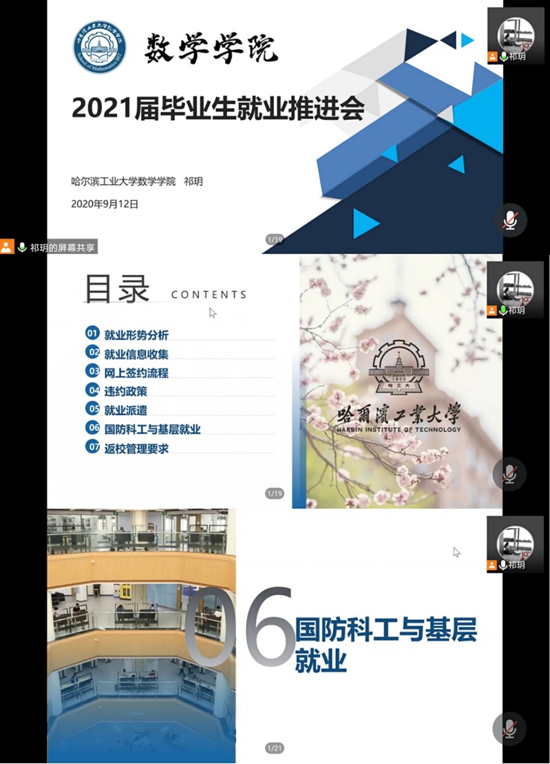 会上,祁玥老师从就业形势分析、就业信息收集、网上签约流程、就业政策与派遣、国防科工与基层就业等方面进行详细说明。首先,她强调了今年不同往年的严峻就业形势,鼓励同学们在9月就业黄金期积极行动,尽早签约,并通过往届毕业生就业数据,帮助同学们思考未来就业方向。随后,祁玥老师对哈工大就业网信息精准查找、生源信息审核、就业推荐表、网上签约管理及就业材料等毕业生相关安排和注意事项进行了介绍。最后,祁玥老师向同学们重点推荐了国防科工与基层单位就业,引导学生积极利用丰富的专业知识投身于祖国的建设和发展中去。