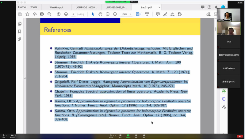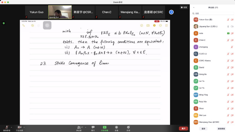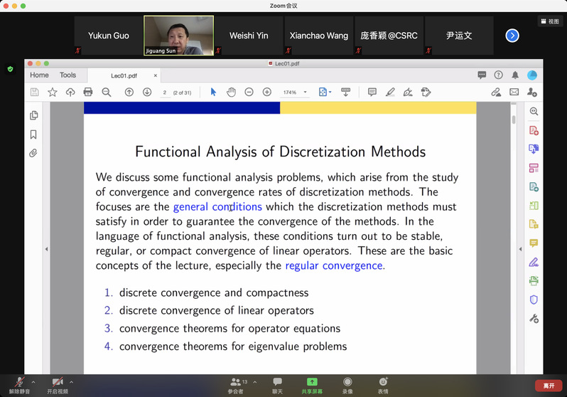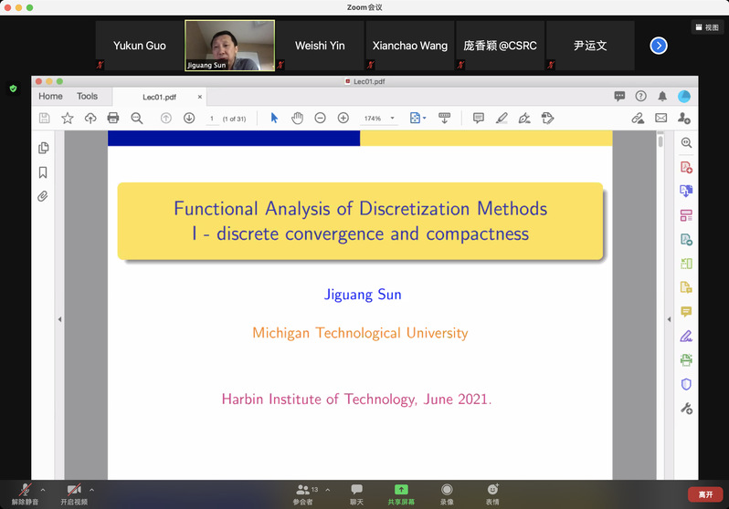 受我校国际项目管理中心资助,应bwin必赢郭玉坤副教授的邀请,美国密歇根理工大学数学系孙继广教授分别于2021年6月15-18日上午9:00-10:30为我院做了四场精彩的在线学术讲座。报告的平台为ZOOM会议。孙老师报告的主题为Functional Analysis of Discretization Methods,报告系统介绍了离散化方法的泛函分析理论,详细讲解了其理论基础和应用。报告由郭玉坤副教授主持,我院多名师生参加了此次在线学术活动,并在会议平台与孙老师进行了热烈的交流与讨论。