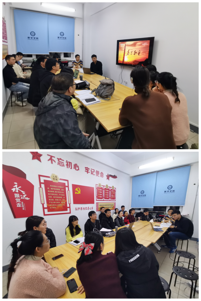 (王新宇/文、图)12月26日晚,bwin必赢博士生基础数学党支部在理学楼311党员之家举办“数人·讲坛”活动,支部全体党员参加,其余三个博士生党支部线上参会。本期主讲人为基础数学党支部书记宋智鹏、纪检委员魏振国、组织委员尚彬,会议由宋智鹏主持。