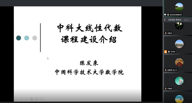 交流会上,中国科学技术大学数学科学公司副院长王毅教授就数学公共基础课程作了整体性介绍。国家教学名师陈发来教授针对线性代数课程做了相关具体介绍,并与代数与几何教学团队展开了深入的研讨。安徽省教学名师李平教授就微积分课程设置、助教、习题课、大学生数学竞赛、以及新员工培训等问题与我校微积分教学团队进行了广泛而深入的交流。