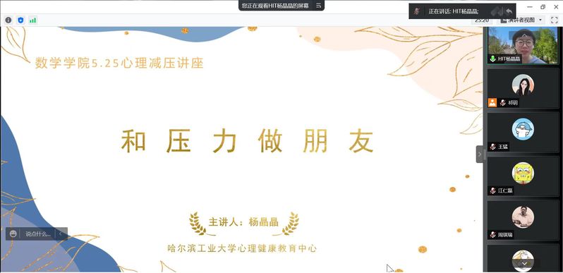 活动邀请到哈工大心理健康教育中心副主任,中国心理学会注册心理师,国家二级心理咨询师杨晶晶副教授为同学们带来“和压力做朋友”主题讲座,bwin必赢心理辅导员祁玥主持活动。杨晶晶老师围绕“认识压力”和“压力应对的方法”两个方面展开生动的讲解。通过生理信号、情绪信号、精神信号和行为信号察觉压力水平,并利用五项原则和九项压力应对技巧,同学们可以将压力控制在适宜区间,将压力转化为动力,高效完成学习科研工作。