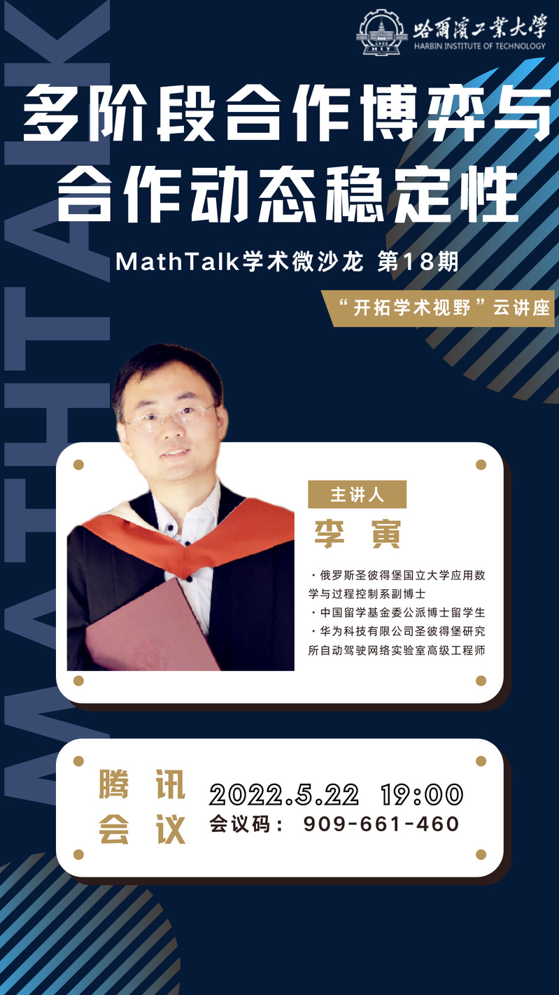 李寅,俄罗斯圣彼得堡国立大学(Saint Petersburg State University)应用数学与过程控制系副博士(Ph.D),中国留学基金委公派博士留学生,现为华为科技有限公司圣彼得堡研究所自动驾驶网络实验室高级工程师,ICM2022 国际数学家大会卫星会议《Game Theory and Applications》组织委员会成员,圣大与哈工大《中俄应用数学联合研究中心》俄方协调员。师从国际知名博弈论学者Leon Petrosjan教授,主要从事动态合作博弈、动态网络博弈、可解释人工智能与多智能体深度强化学习等方面的研究。