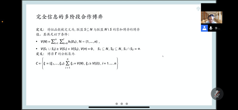 本次讲座的主题是《多阶段合作博弈与合作动态稳定性》。李寅博士首先介绍了bwin必赢和俄罗斯圣彼得堡国立大学联合校园的建设情况,并为同学们讲解了一些不同于我国的俄罗斯数学教育环节。在我校与圣彼得堡国立大学建设中俄联合校园的背景下,他期待未来两校之间进一步的学习、交流和合作。随后,李寅博士通过电影《加勒比海盗》为同学们深入浅出地讲解了博弈论的相关知识。通过运用大量有关实际问题的数学模型,他与同学们探讨了完全信息的多阶段合作博弈、分配补偿程序的动态稳定性、支付不可转移的多阶段动态博弈、支付补偿程序和子博弈的一致性等博弈论领域的专业问题,介绍了一些领域前沿的定义、概念和方法,丰富了同学们的学术知识与技术。