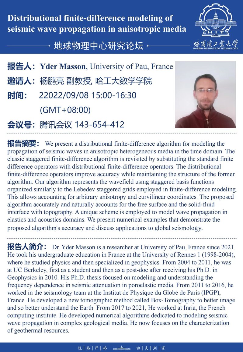 法国波城大学研究员Yder M asson关于地震波分布式有限差分的报告通知