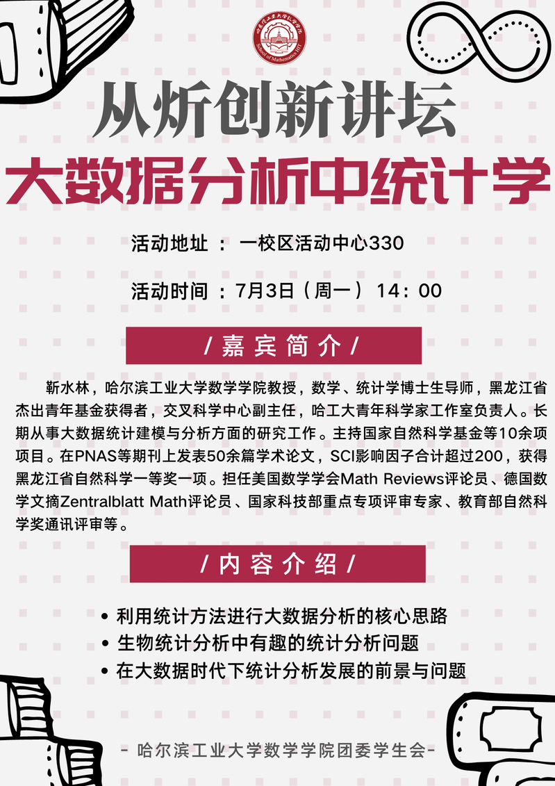为推动学习贯彻习近平新时代中国特色社会主义思想主题教育走深走实,加强基础研究,促进数学、统计学与多学科交叉融合,拓展学生学术视野,拟举办从炘创新讲坛第四期——“大数据分析中统计学”讲座,介绍数学与生物信息领域的相关理论与应用。