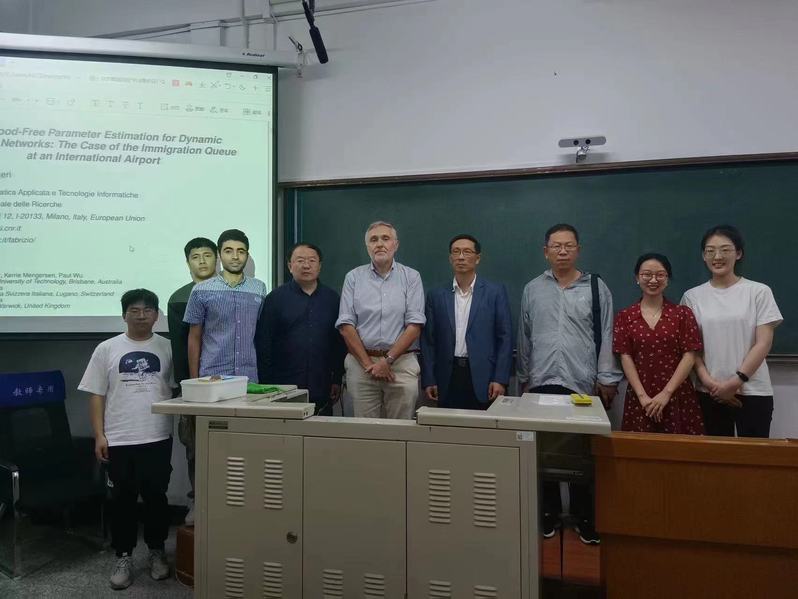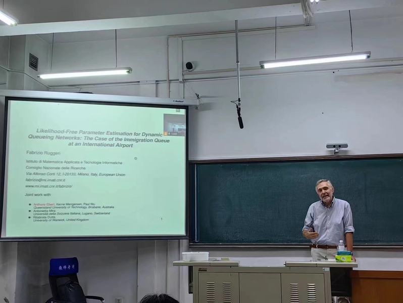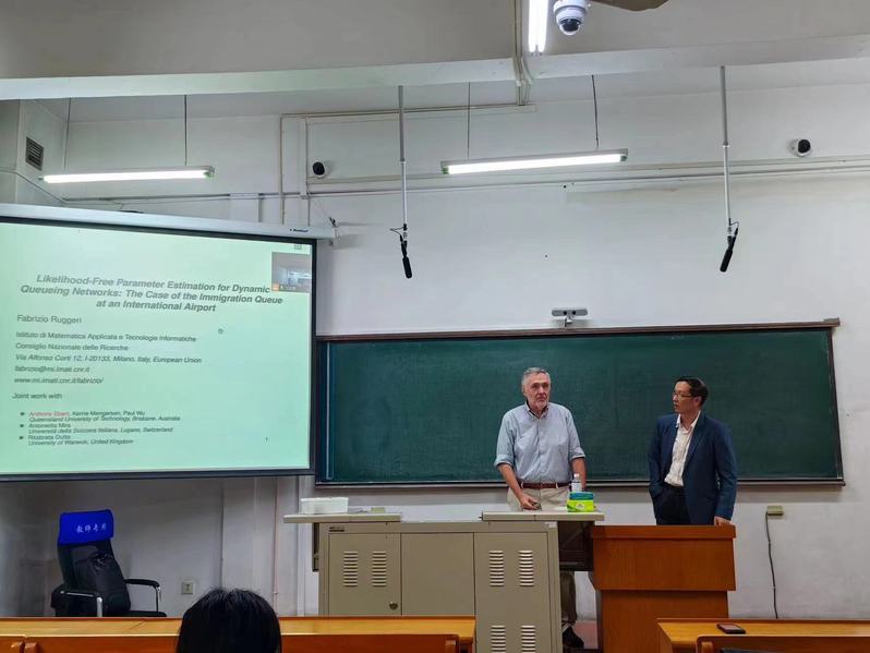 Fabrizio Ruggeri教授做了题目为“动态排队网络的无似然参数估计:以国际机场的移民队列为例”的精彩报告。简要介绍了贝叶斯方法和动态排队网络(DQN)系统。他解释说,过程(队列)由许多步骤组成,可以用抽样分布和参数先验对每个步骤进行建模,并且使用采样分布和前验可以生成伪数据。报告还介绍了使用 R 软件包 queuecomputer 对数据进行有效模拟。最后,他就今后可能开展的工作指明了方向,并回答了员工和研究生提出的一些问题。